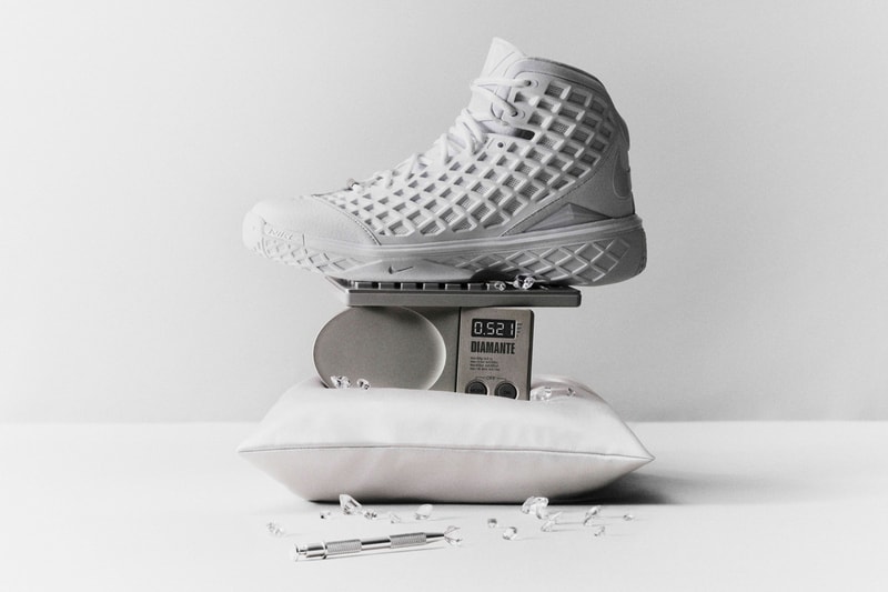 The shoe, which was originally inspired by basketball nets, sees its netting backed by mesh that offers a combination of containment and airflow. Meanwhile, new diamond geometry at the upper serve as a nod to Kobe's eldest daughter, Natalia, whose middle name is Diamanté and appears in the marketing campaign that is embedded below. As for the modernized sole unit, its new design is informed by insights from athletes who experienced the original Kobe 3. A full-length Zoom Strobel replaces the smaller Air Zoom units of the past, combining with a Cushlon 3.0 midsole and an updated traction pattern for peak performance. Arriving as part of the third annual "Halo" drop, this all-white rendition of the shoe kicks off its comeback.