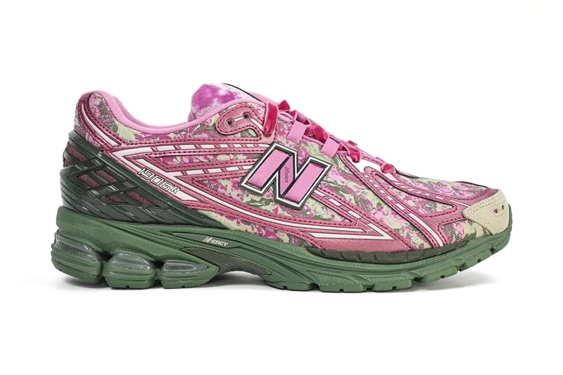 Surfacing online via @fkzsnkrs, the first look images show how Harlow has reimagined the classic model. The 1906R shows a mixture of pink and magenta florals throughout the upper while a premium aesthetic is injected through its velour tongue and lace detailing. Water color paintings of a man and woman are seen on the insoles while the shoe sits atop an earthy green rubber outsole to round out the design.