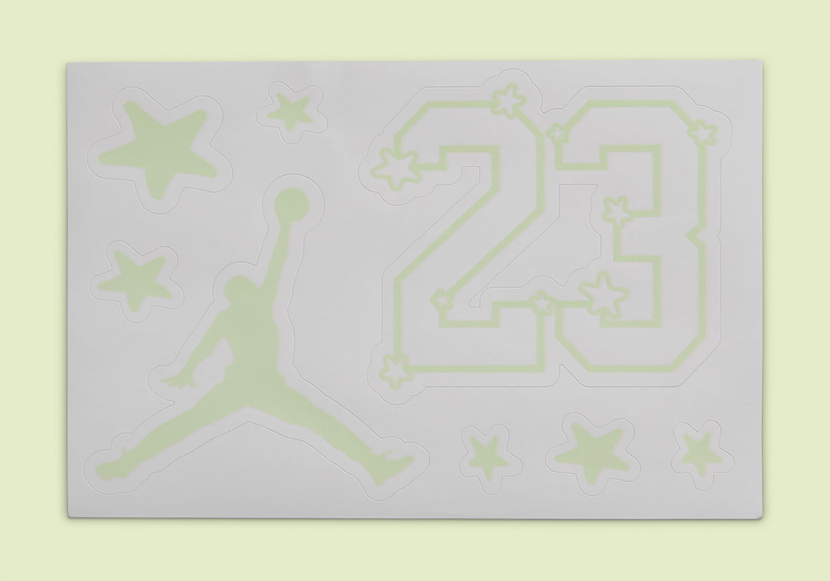 As promised in the title, the shoe’s main draw is likely the pale green translucent sections, coating the eye-stay wings, tongue and outsole with glow in the dark sheens. The motif is also applied through stars on the heel counter and on the Swoosh in a similar spot, evoking the classic starry ceiling from kids’ decor. Narratively, it connects well to the shoe’s title, another instance where the meteoric heights that Jordan reached are parlayed into an inspirational message for the younger generation. Finally, paying off our intro, the doodle-laden Sneaker School box closes out the delivery, adding some final playful touches to in the packaging.