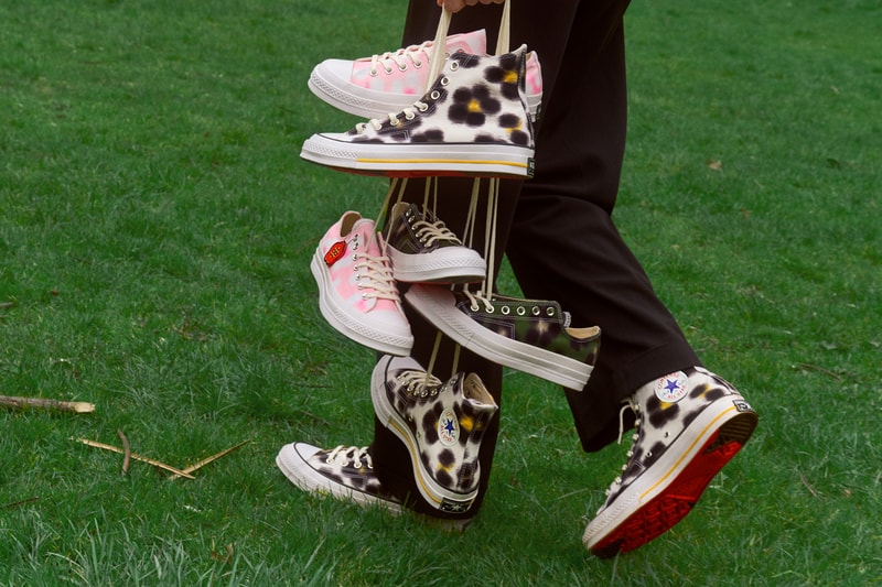 Both the Chuck 70 Low and Hi play a role in the collaboration, taking on NIGO's Hana Leopard print across the uppers of each. Colorways of "Pink Cosmos," "Cypress," and "Sweet Corn" present compositions of pink and white, green and black, and black, white, and yellow respectively. Each pair also features KENZO’s signature boke flower as a hangtag and outsole graphic while co-branding comes courtesy of the sockliner and special KENZO heel detail at the back of each left shoe.