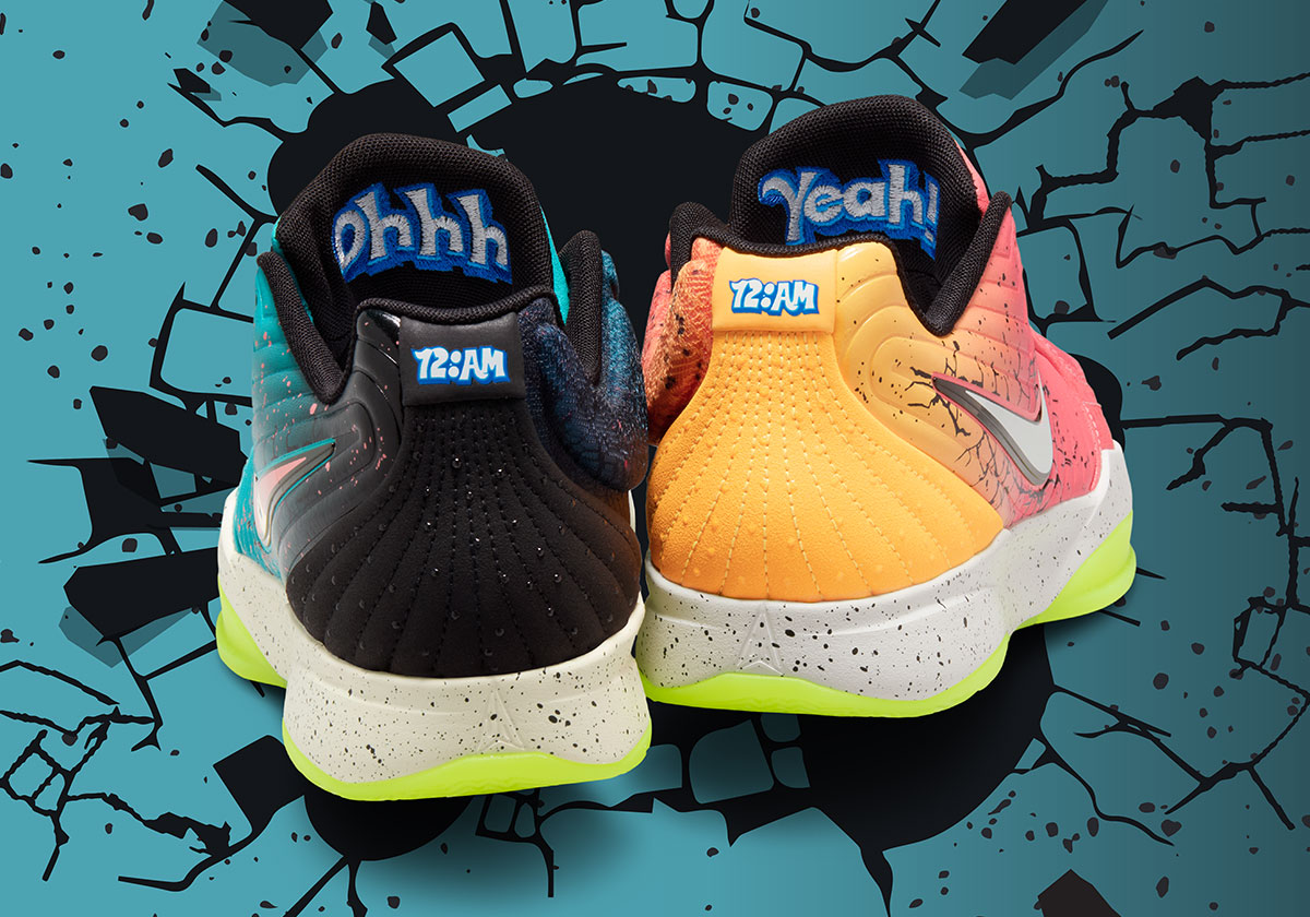 True to those initial shots, the first half of the collection serves up a saccharine take on the mismatch motif that Morant thoroughly explores in mainline editions. “Pink Lemonade” and “Blue Raspberry” flavoring drape the uppers of either shoe, further contrasting each other with black and orange heel cups. Along with emblem depictions of the Kool-Aid Man, either shoe is joined by green apple outsoles underfoot.