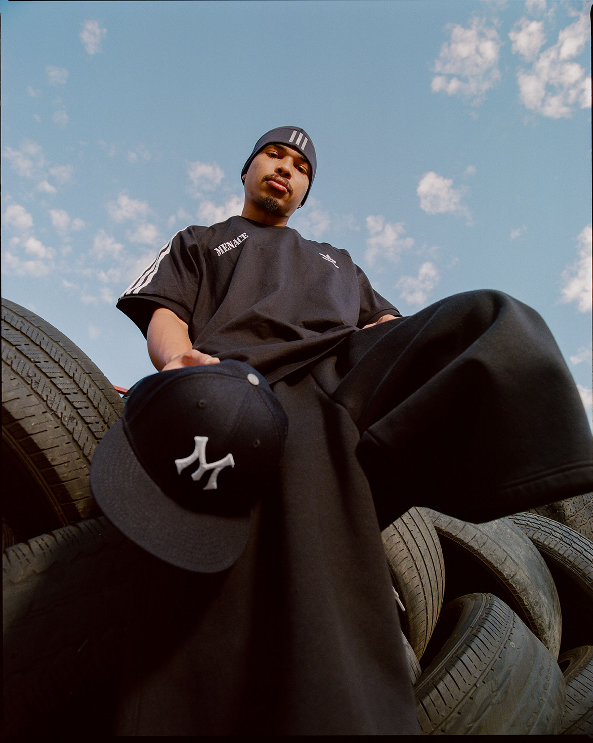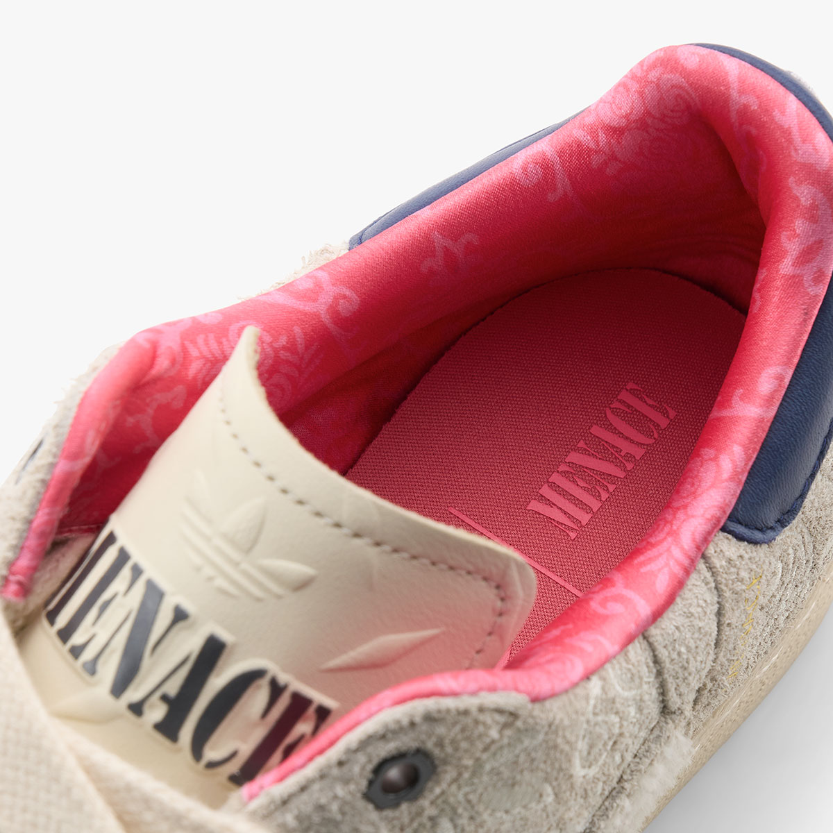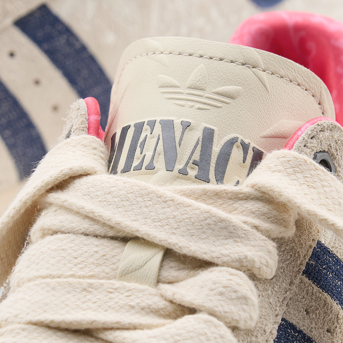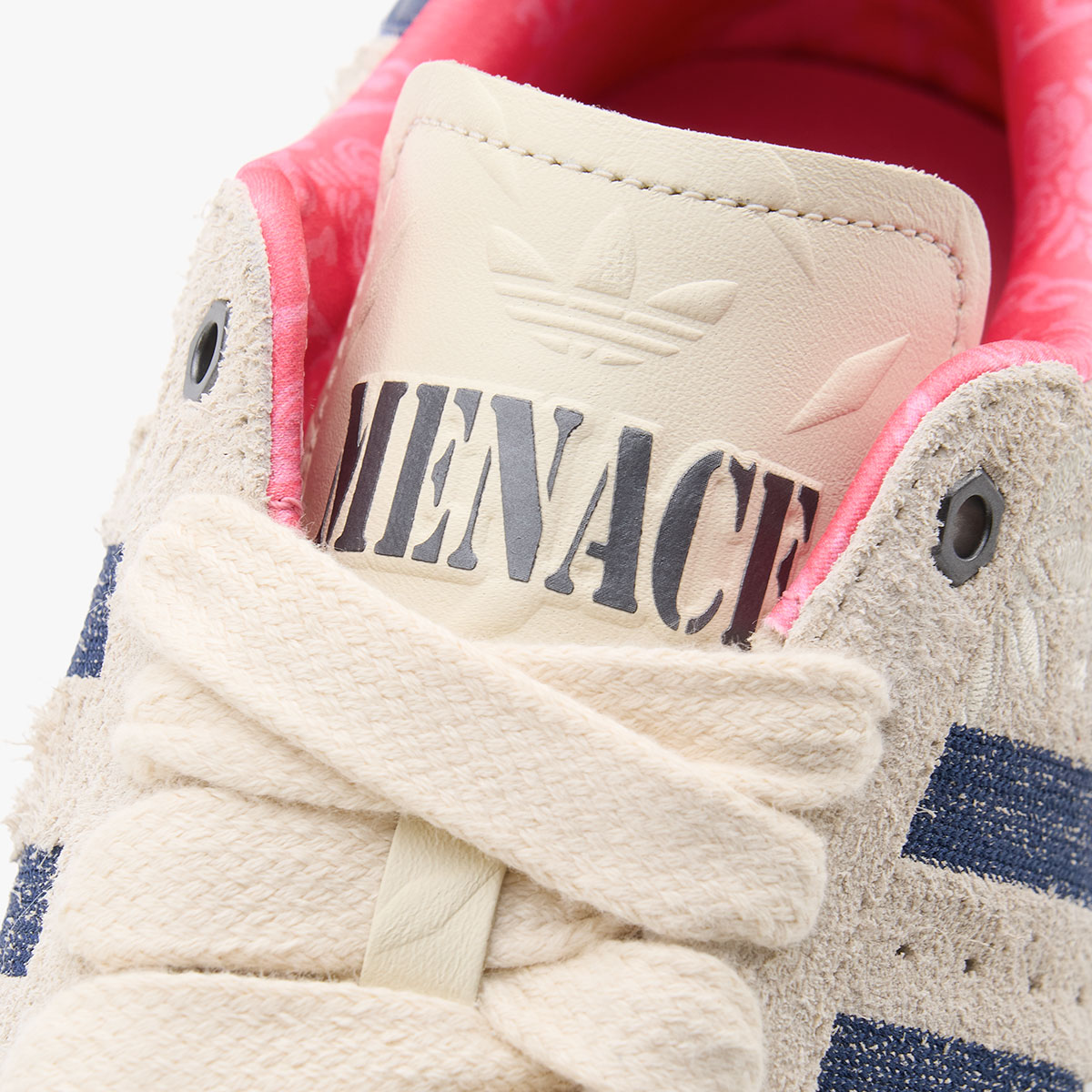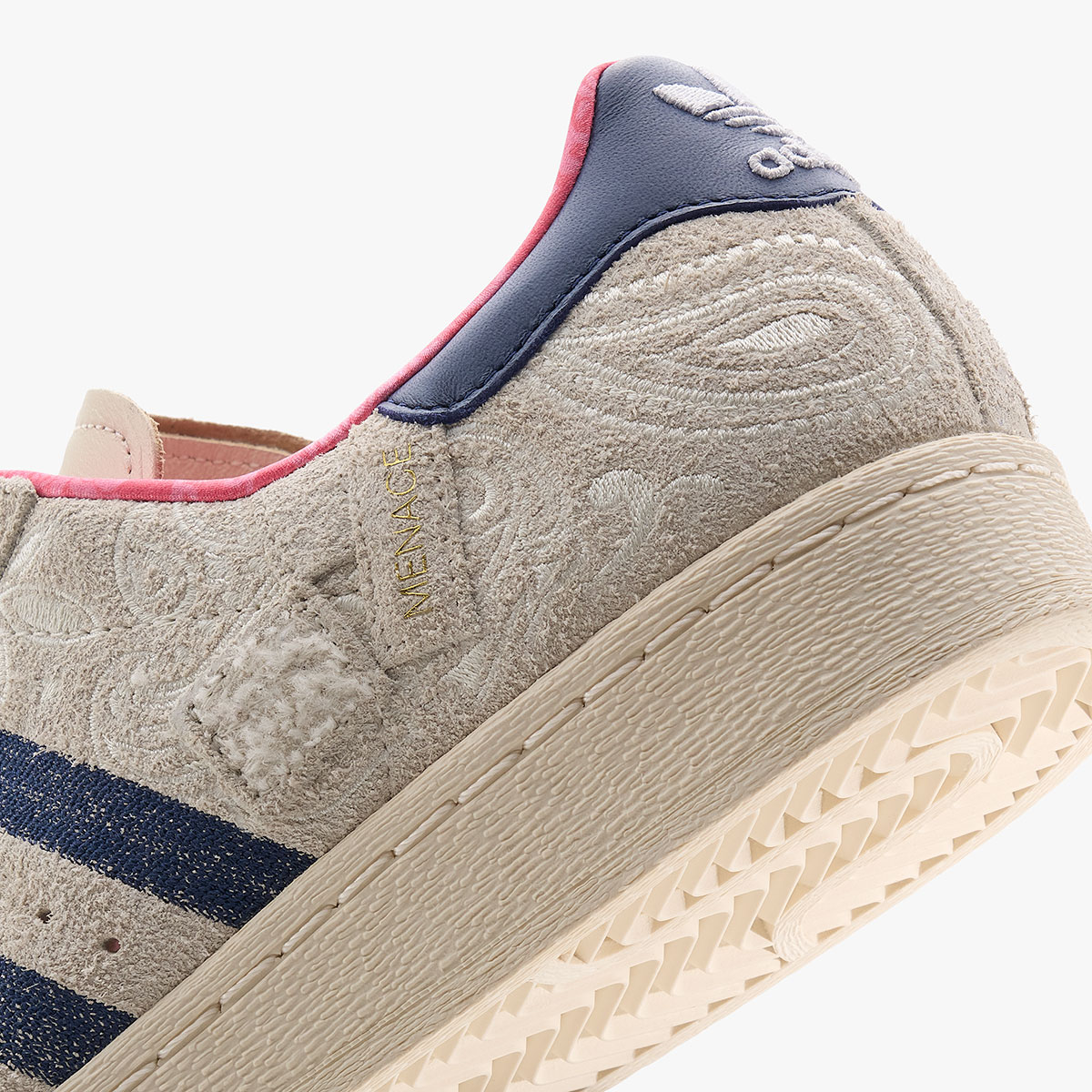 Paisley stitching adds a signature MENACE touch, complemented by the brand’s Yankees-inspired “M” logo embroidered on the right heel tab. The tongue showcases navy blue MENACE branding alongside an embossed Trefoil and diamond-plate steel pattern — a motif echoed inside the shoebox. Bolt-shaped eyestays subtly extend the industrial theme, the stripes are embroidered in navy, and two small rectangular patches on the lateral side add some welcome depth.