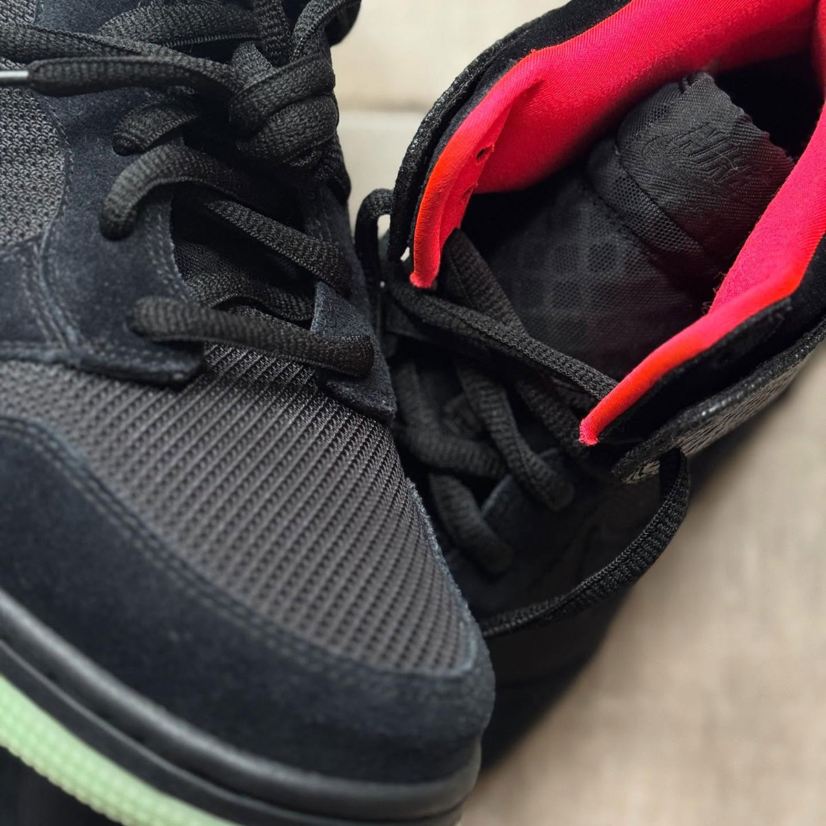Made to resemble Kanye’s second sneaker with the Swoosh, this Dunk High features a black upper constructed from suede, mesh, and croc-skin leather at the heel. A red sockliner and semi-clear green outsole complete the tie-in with Kanye’s Air Yeezy 2.