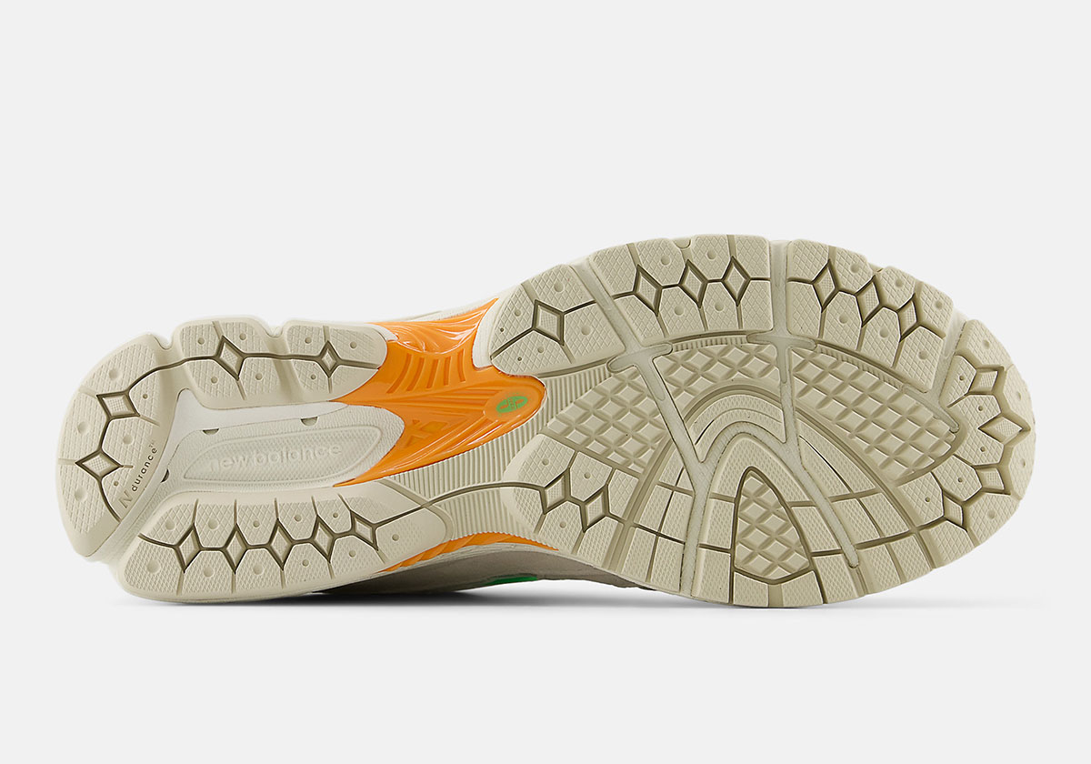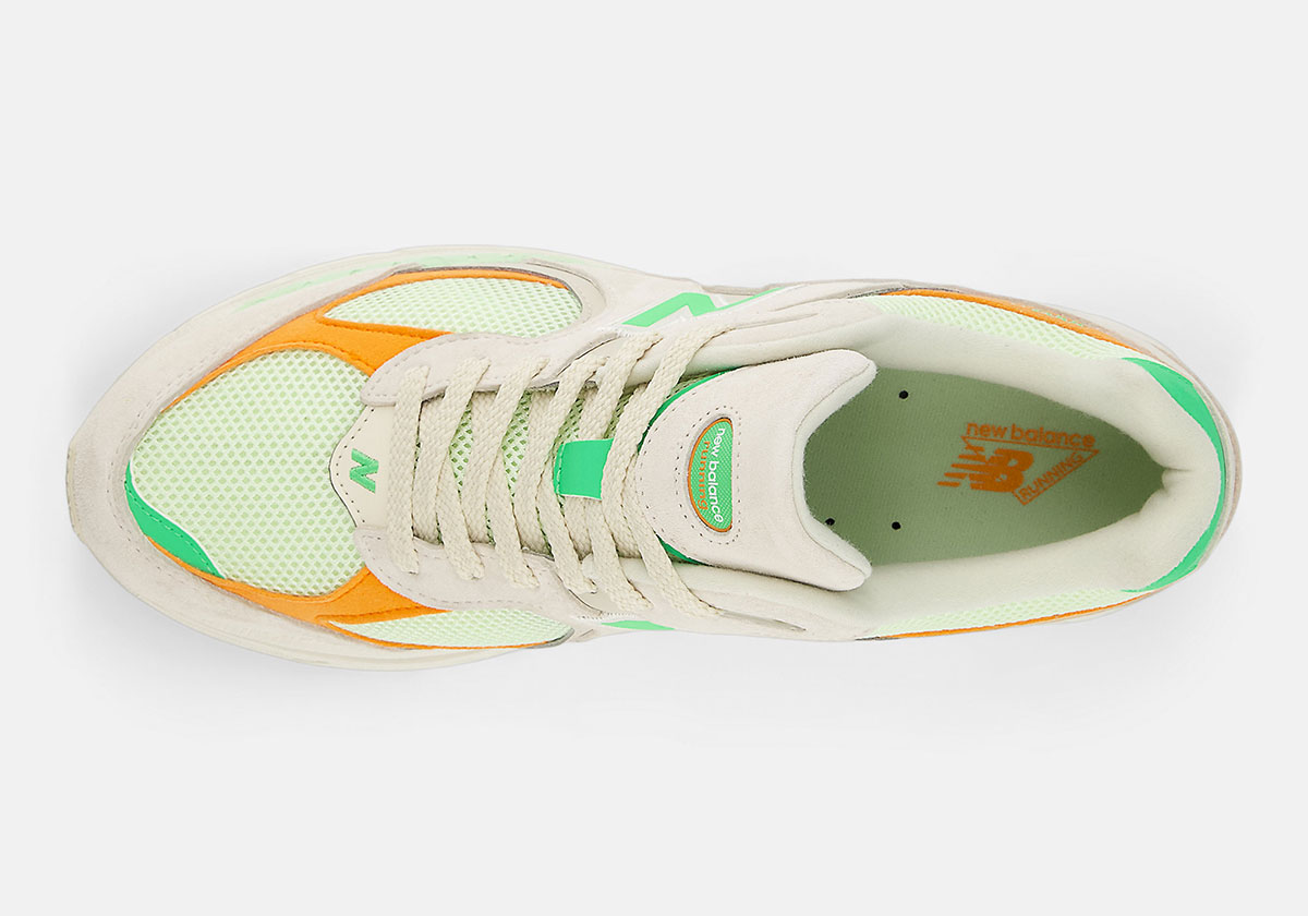 Official images reveal light “Green Apple” coloring on the base and portions of the midsole, complemented by a slightly more vibrant green shade on the N logos, backtab, and tongue accents. The underlays are comprised of orange “Sizzle” suede for added playfulness, while the rest of the build keeps things simple in “Linen.”