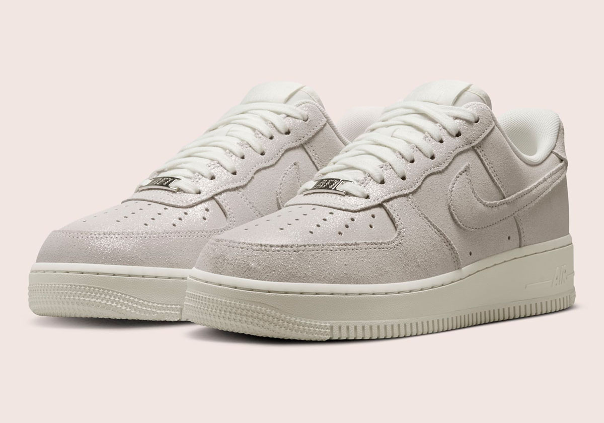 As promised in the title, the bedazzled dubrae that sits at the base of the laces is the most notable inclusion, a novel touch that pins mini crystals on chrome, spelling out “AF1” in the process. Moving to the uppers, the shoe utilizes a heavy dose of glittery suede in pale pink, a comprehensive treatment from the heel to the toe. An off-white “Sail” sole and similar tonality on the laces & sockliner round the design out in the margins, those neutral hits ensuring a grounded profile in sum.