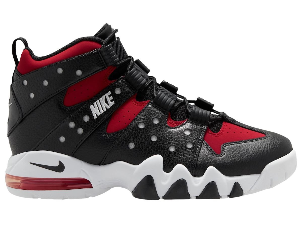 More specifically, the Nike Air Max2 CB 94 in "Black Gym Red" showcases a combination of Black, White, and Gym Red hues. This colorway is instantly associated with the Chicago Bulls, a team that Barkley engaged in numerous memorable battles with during the late '80s and '90s. The shoes feature a base adorned with Red nubuck, complemented by Black leather overlays and perforations. White accents grace the embroidered Nike branding on the lateral side, as well as the Nike Air logos on the heels and midsole. Additional details include Red accents within the Air unit and predominantly White on the outsole, with subtle Black highlights.