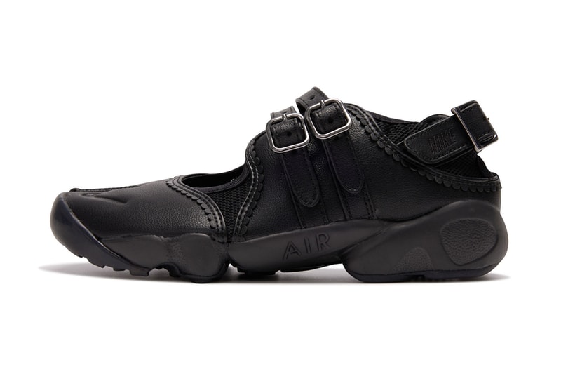Name: Nike Air Rift “Buckle Strap”Colorway: "Black/Black/Black"SKU: IB8881-001MSRP: $799 HKD (approx. $102 USD)Release Date: Available nowWhere to Buy: NikeNike’s Air Rift steps into new territory, embracing the balletcore trend with a fresh take on its signature split-toe silhouette, this time featuring buckled leather straps and a sleek, all-black finish.The upper is crafted from smooth black leather, paired with an elastic liner for a snug, comfortable fit. Moving away from its usual nylon fastenings, this version introduces three buckled leather straps - two across the forefoot and one around the heel - adding a utilitarian twist. Scalloped edges on the leather panels soften the overall look without disrupting the tonal theme. As a playful nod to spring, a pink and yellow cherry blossom accessory adds a subtle pop of color.Click here to view full gallery at Hypebeast