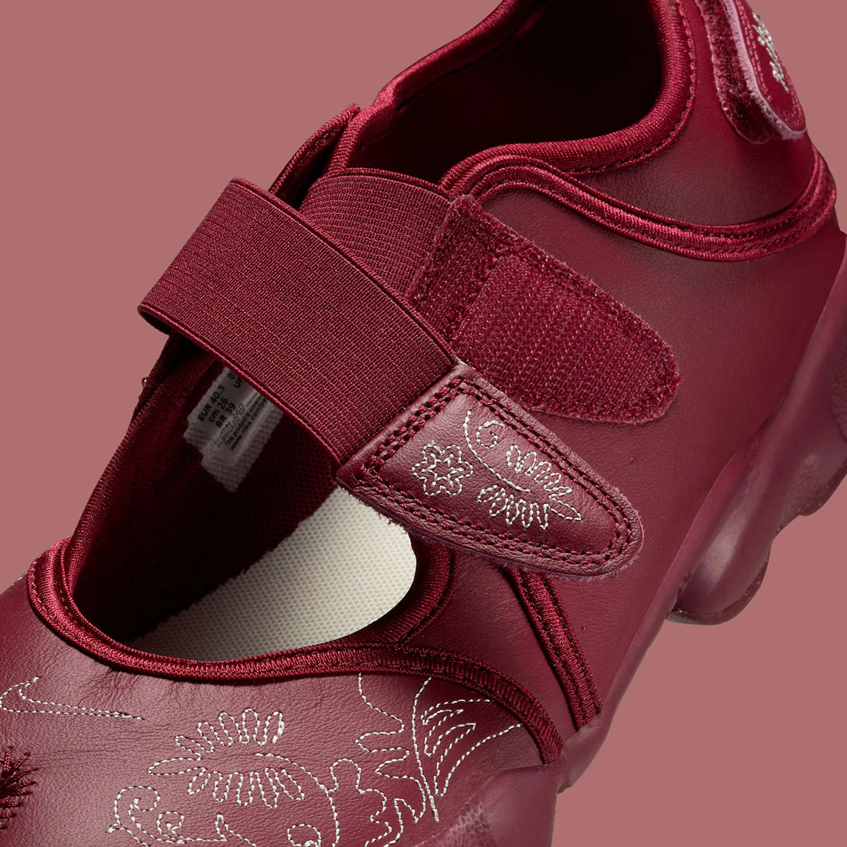 Official images reveal a “Team Red” leather colorway featuring different sections of ferns throughout, namely on the tabi toe area, medial leather panel, and tip of the elastic forefoot strap. Cursive “Nike” text appears on the heel strap, while a Swoosh appears just atop the model’s controversial split toe. This is just of of several different identities the Air Rift has assumed in recent months, preceded by ballet-inspired pairs, suede and mesh looks, and even an all-black style featuring buckled straps.