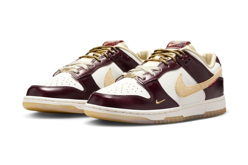Name: Nike Dunk LowSKU: HV5991-171Colorway: “Year of the Snake”Retail Price: $125 USDRelease Date: 2025Retailers: NikeNotes: Nike has unveiled another Dunk Low offering for Lunar New Year 2025. This women's exclusive "Year of the Snake" model is built with a white leather base and contrasting patent leather overlays in a deep cherry hue. Gold suede lands on the panel swoosh, which is also fitted with red stitching, while additional branding can be found on the mini lateral check, insoles, snakeskin tongue tag and embroidered Nike heel logo. The sneaker then rests on a white midsole and Gum outsole, while flat white and gold rope laces with eye-catching gold dubraes tie the iteration together for a clean finish.Click here to view full gallery at Hypebeast
