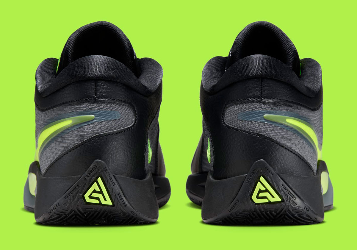 Long-time fans of Giannis’ line may recognize the neon green & black arrangement on offer here- it reprises the same colorway last seen on the Zoom Freak 2. Borrowing its foremost colors from the kits of the Nigerian national football team, the radioactive shade makes a stark impression on the myriad of branding notes throughout the shoe, including the oversized Swoosh and Antetokounmpo’s own logos at the heel and tongue.