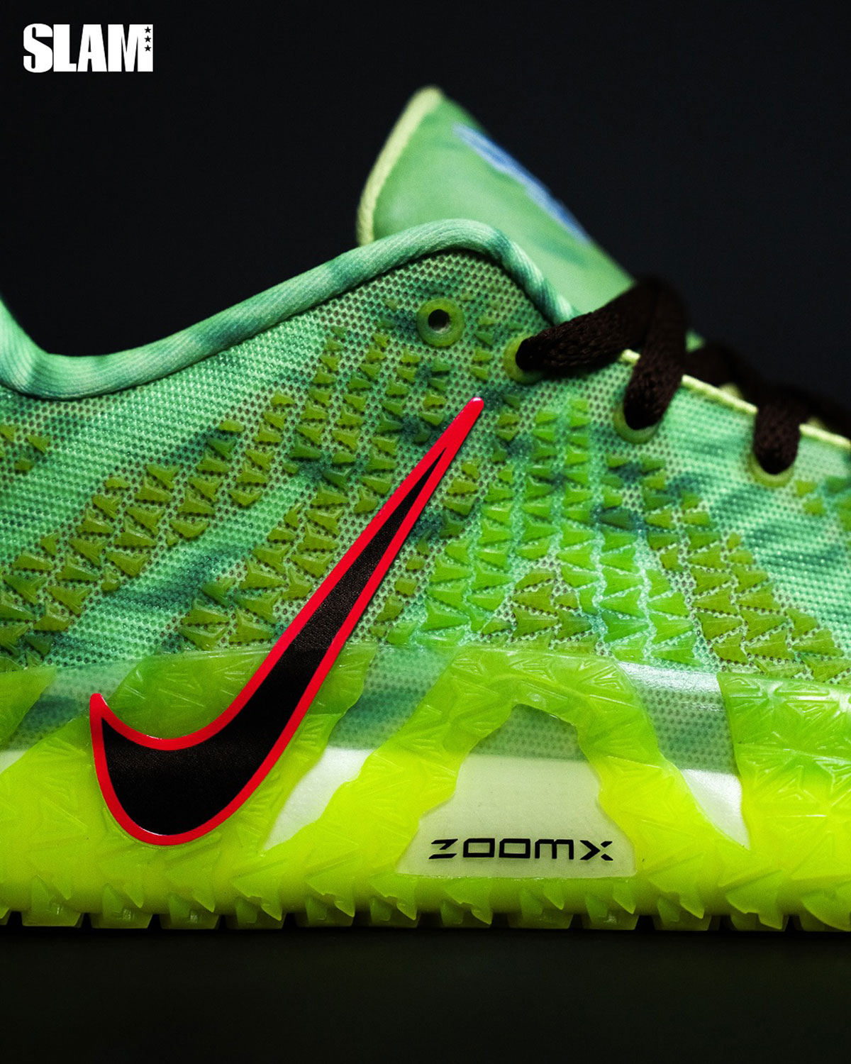 Rather than the traditional orange and black scheme, the Nike Ja 3 “Halloween” opts for something far more ghoulish, overtaken by radioactive green and yellow that crests with a hazy, marbled pattern on the underlying mesh foundation. Really driving home the spooky overtones is a creative touch on the interior, where Morant joins the ranks of the undead on a full-length graphic insole; also the case for a set of fang dubraes and a twisted Ja logo on the tongue. Lastly, under light you’ll see this shoe become entirely impossible to miss, as the sole and Ja chevron logos on the upper feature a glow-in-the-dark finish.