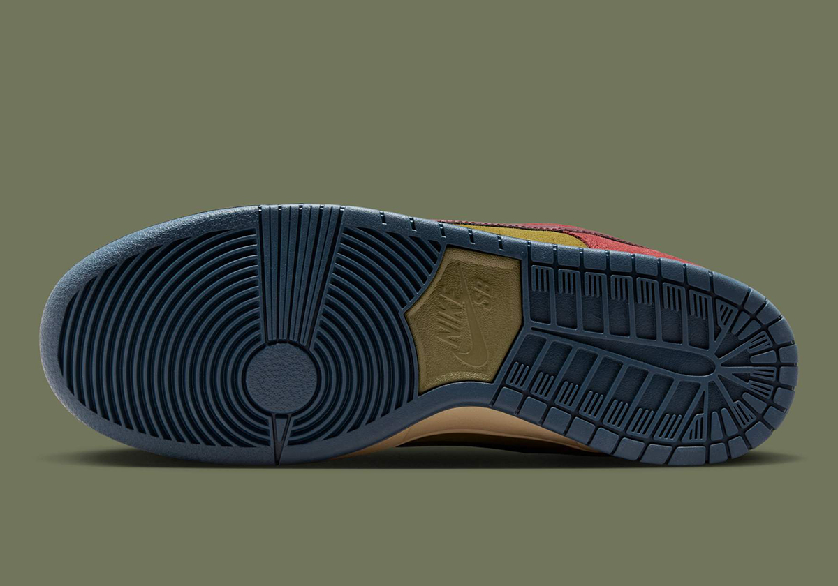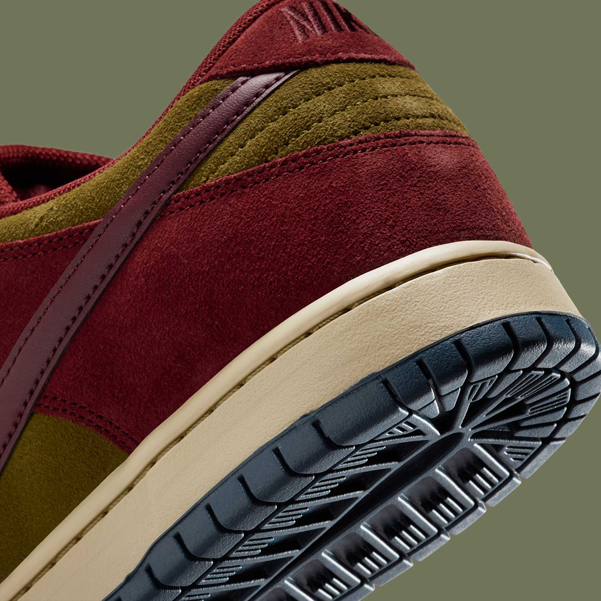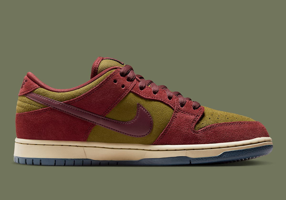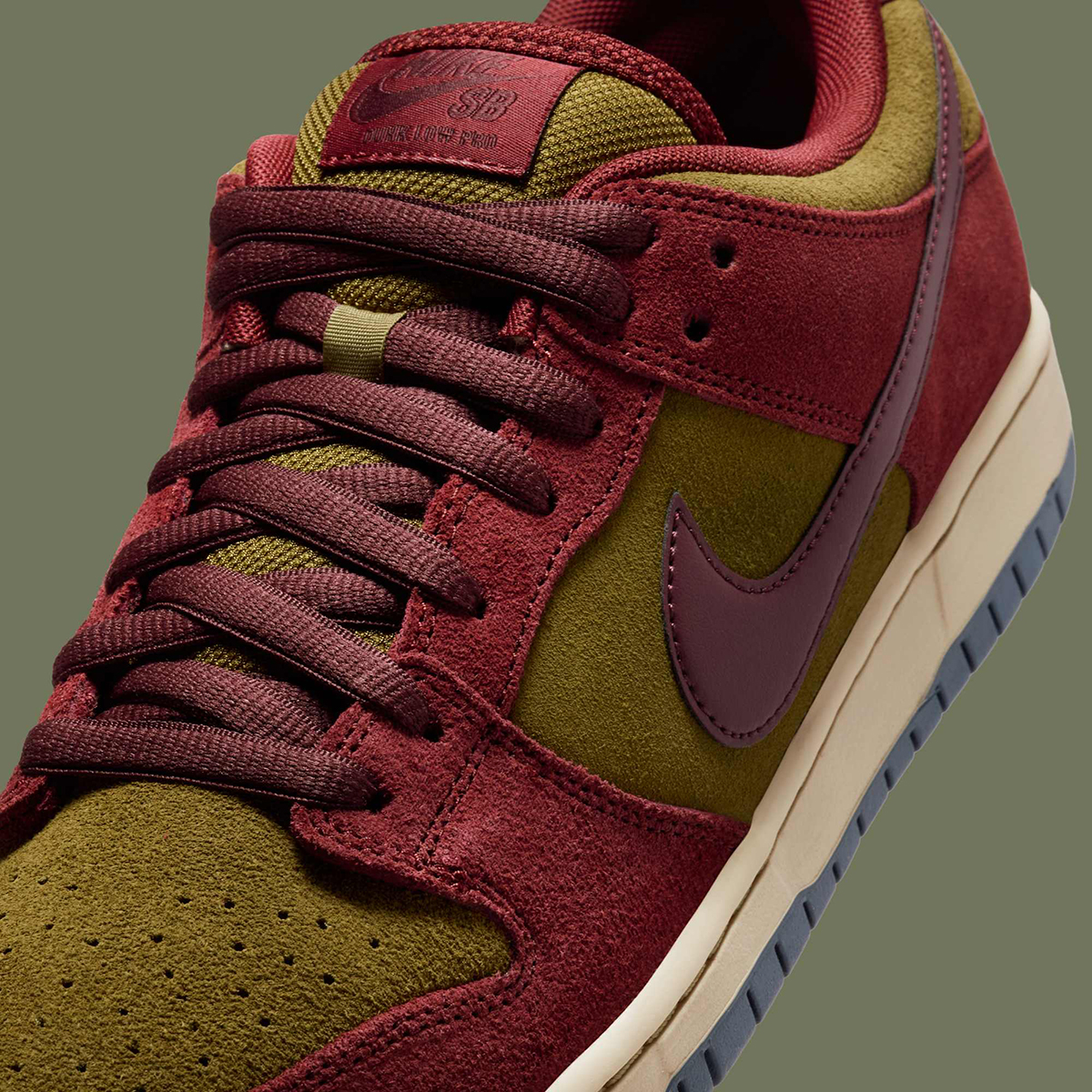 First surfacing via in-hand shots earlier in 2025, the chiefly suede build remains the biggest draw with this pair, taking over both “Olive Flak” underlays and the “Dark Team Red” swatches above that lend this pair its name. Helping create a cohesive profile is the glossy purple Swoosh bisecting this design, providing a midway point between the cerulean outsole and the other primary shades. Given the deep roster of looks for both the Dunk and SB Dunk, comparison points are present in spades, but the “Bart Simpson” and select CO.JP releases harken to the multi-color arrangement on display here. All told, it’s another pair without much in the way of bells and whistles; welcome news for those looking to make good on the SB Dunk’s name.