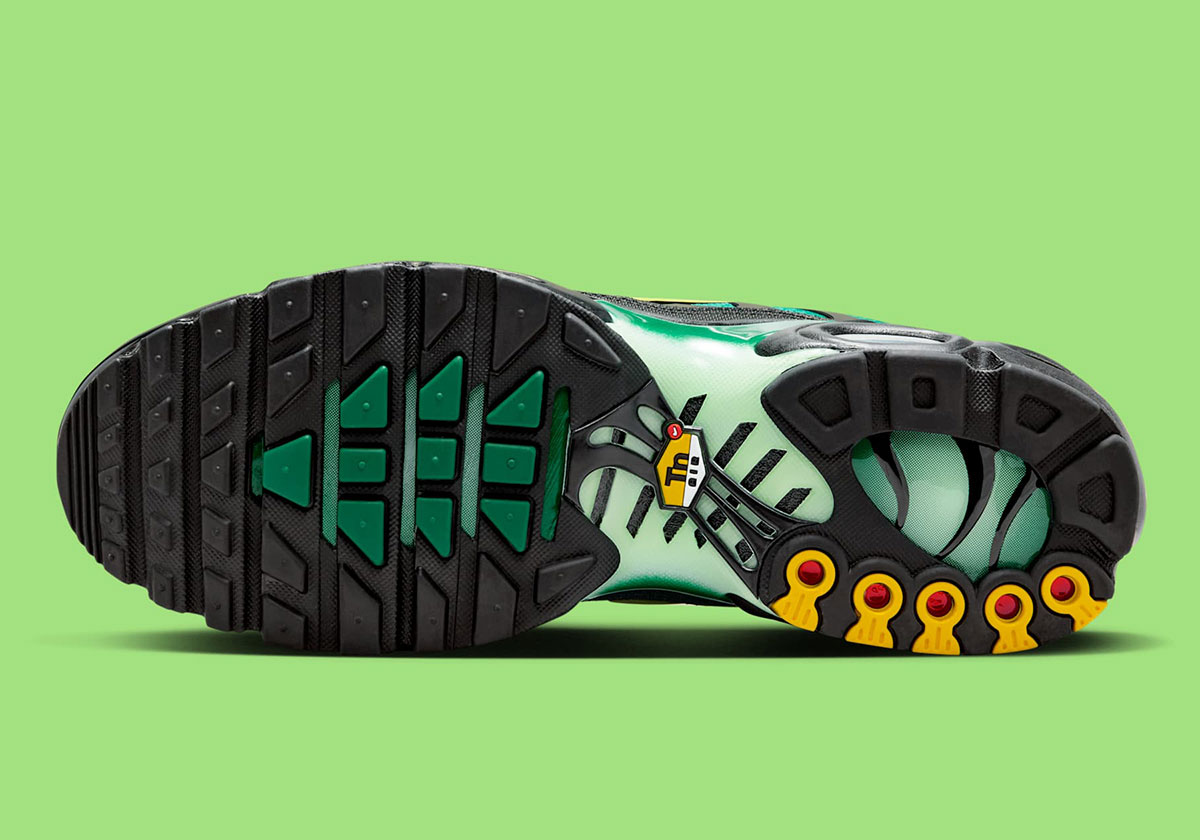 This newly-uncovered pair accomplishes a lot by taking note from the OGs, opting for a gradient upper that transitions from “Vapor Green” to “Malachite” as you move towards the mudguard. The same scheme appears on the center portion of the midsole, while the wave-inspired overlays, mudguard, and rest of the midsole come in black for cohesion. More “Vapor Green” hits appear on the Swoosh and Air bubbles, and yellow accents make their usual appearance on the Tuned Air logo, outsole, and medial side of the heel unit. All things considered, we’re getting a St. Patrick’s Day feel from the holiday-friendly combo of green and yellow.