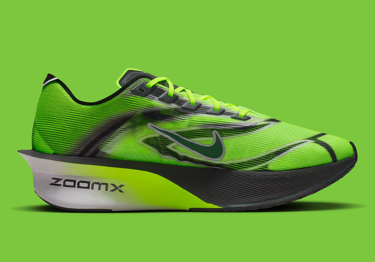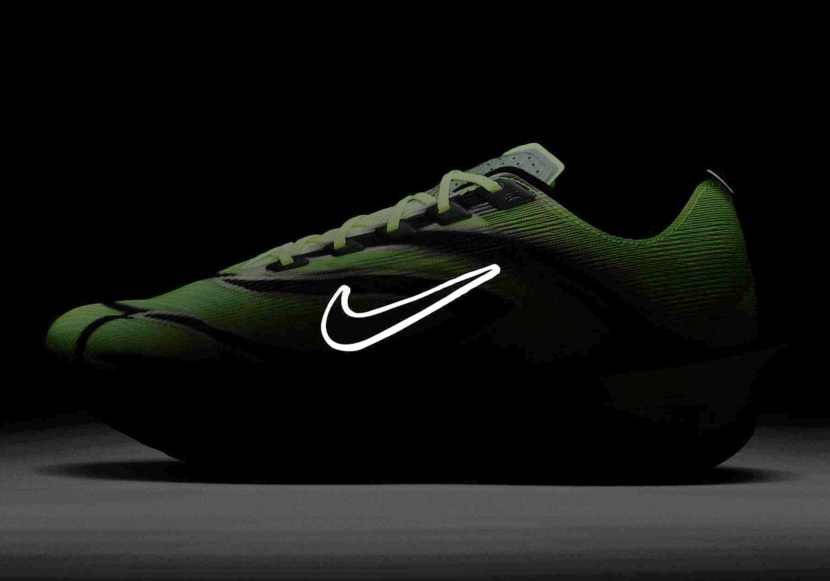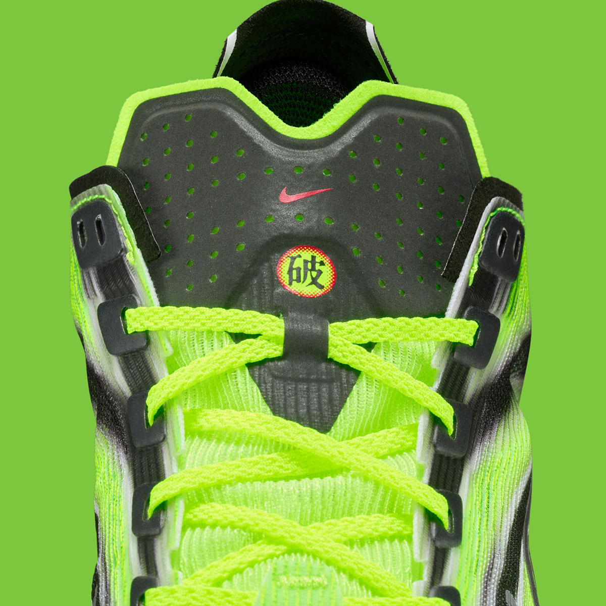 The Nike Vaporfly 4 “Ekiden” alludes to the Streak series with sharp, almost tribal-like black graphics over a lime green base, although no one specific model comes to mind. Japanese characters appear on the tongue, insoles, and spine, while the midsole features black paint up front and a green gradient at the rear.