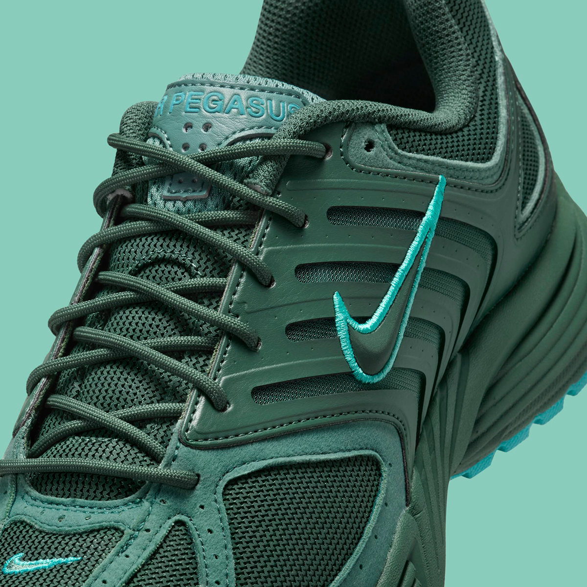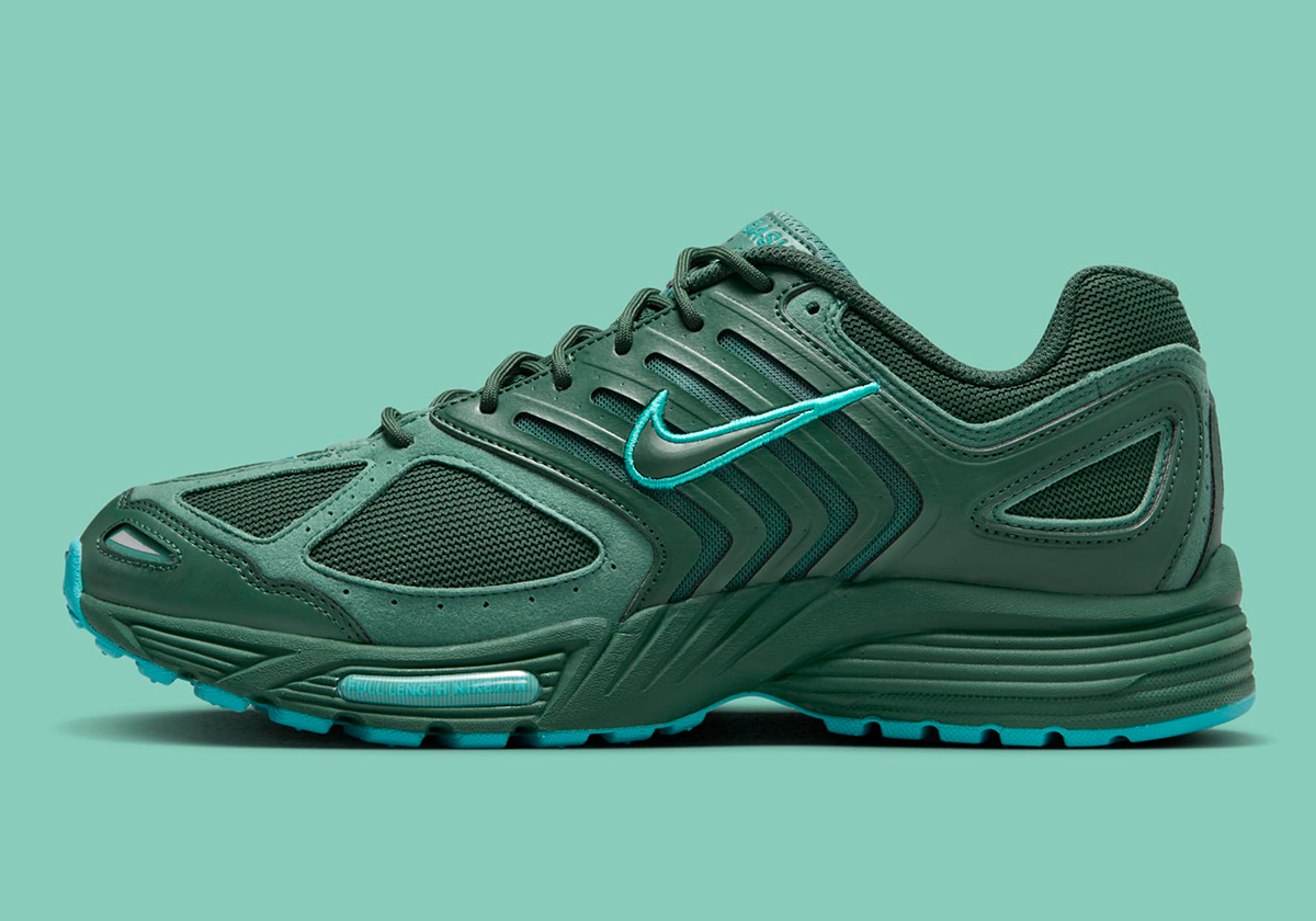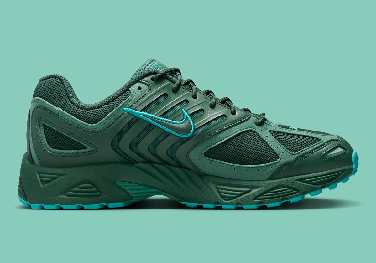 The titular hue accounts for the bulk of the design, with “Fir” pasted onto the leather cage, toe, mesh base, and midsole. The underlays and tongue bring a slightly lighter “Bicoastal” shade into the mix, while bright “Dusty Cactus” dots the tongue, Swoosh, and outsole. Nike also includes rope laces as opposed to oval-shaped sport ones, adding a bit of trail shoe sensibility to complement the shoe’s earthy palette.