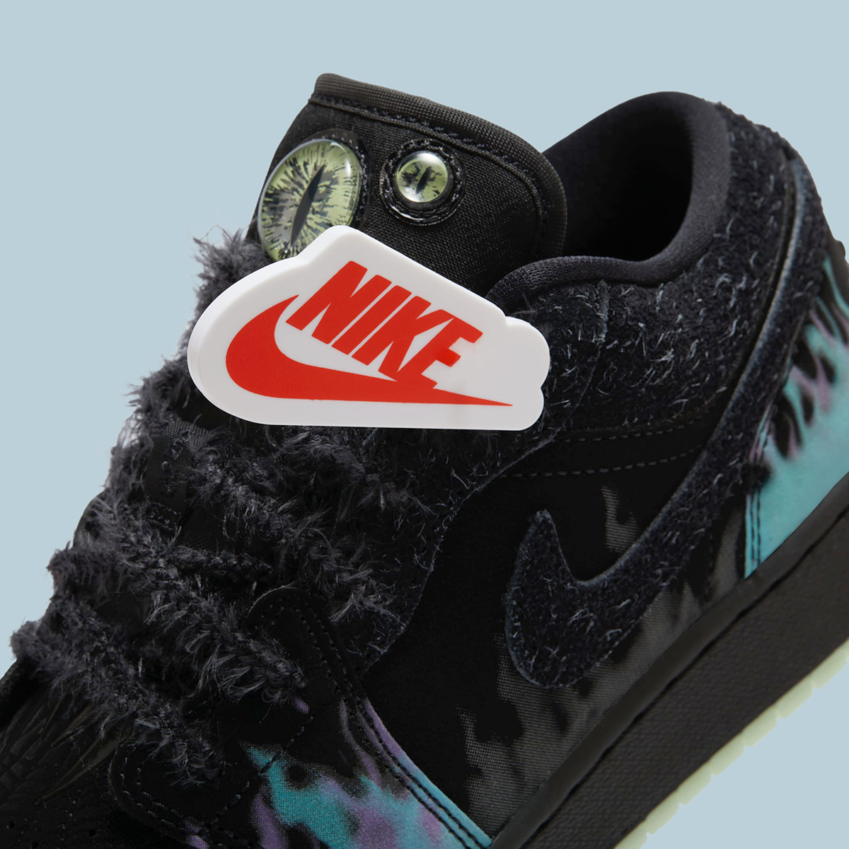 Initially thought to be inspired solely by Mike’s alter ego and Black Cat Jordans, it’s now clear that the shoes are inspired by both cats and spiders. A throw-in set of stickers provides evidence, one of which features a Frankenstein-esque graphic of a black cat-spider monster. As for the shoe itself, official images are consistent with our initial preview. The tongue features light-up cat eyes, fang detailing spreads onto the toe box, and the overlays boasts an assortment of different textures inspired by both creatures.