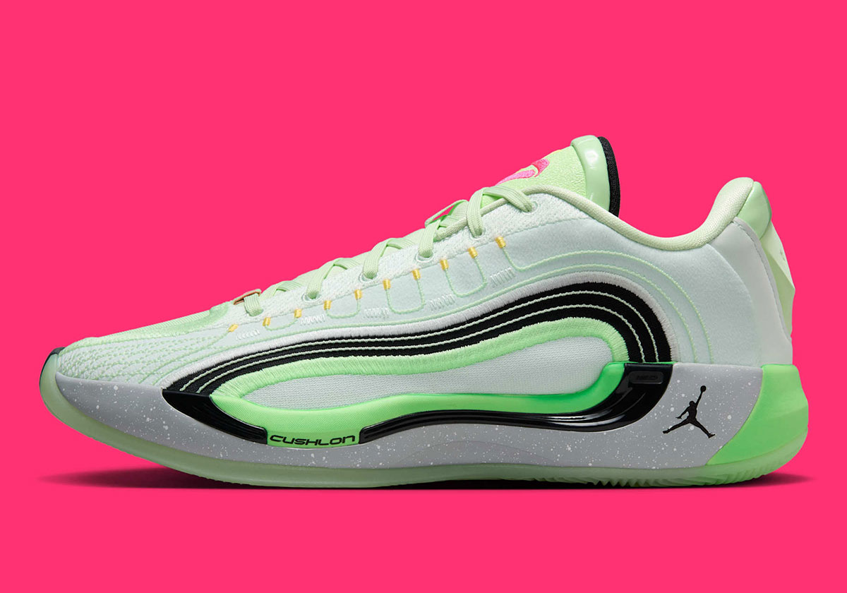 The Luka 4 maintains the same low-top height of its predecessors, and while we’ve yet to get a full tech rundown from the Jumpman, it appears to come with Cushlon foam underfoot. The design is anchored by an abstract oval shape on the lateral side. Stitched lines on the base are joined to a TPU structure within the midsole, framing a patch of canvas material in the middle. Luka’s “77” logo appears on the tongue and outsole, matched by embossed numbering on the medial side of the sole. The model will in fact roll out in the “Barely Green” colorway worn by Luka against the Mavs, taken with black, “Hyper Pink,” and yellow detailing.
