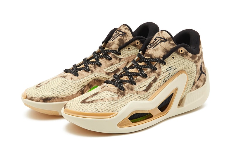 The fresh, new colorway hits shelves in 2024 and is dressed in neutral earth tones. Boasting a sail mesh upper featuring tie-dye like camouflage pattern seen on the canvas overlays on the heels, tongues and eyestays, the shoe's details like the "JT" emblem and speckled laces, as well as the Jumpman logo are all in black. The Volt contrasting accents grace the heel tabs, medial side and insoles. The shoe sits atop a sail rubber sole and gum traction to round out the shoe.