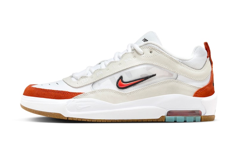 The upcoming release sees the shoe take on a white, orange, summit white, black and gum light brown color scheme. Leaning into the early-2000s aesthetic, the shoe's blend of mesh, leather and suede materials takes skateboarders back to the era. Air Max cushioning is used for optimal comfort, necessary for skate sessions. The suede orange highlights the toes while other orange highlights hit the heel tab, Swoosh and heel. Wair's branding is seen on the eystay, tongues and insoles while the classic "Nike SB" logo is on the heel. The shoe sits atop a gum light brown rubber outsole to round it all off.
