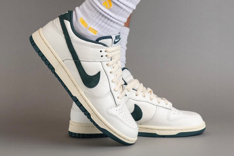 Following the reveal of the on-feet look at the Nike Dunk Low Athletic Department in "University Blue", Nike adds yet a another colorway to the pack, continuing to capture the nostalgic varsity vibe with "Deep Jungle."As the color options expand, the latest color palette relies on the green hue to underline the shoe, which features sail, deep jungle, coconut milk and white tints. The shoe is constructed out of a sail premium leather upper with perforations at the toe box for optimal breathability. The green accents highlight the Swoosh, heel tabs, tongue branding, tongue rim, inner lining and rubber outsole. The shoe features the Athletic Department branding in the insoles while it sits atop the sail midsoles.Look out for the Nike Dunk Low Athletic Department "Deep Jungle" arriving in the coming months in the Fall at select retailers and online at Nike for $110 USD.In other footwear news, take an official look at the Nike Dunk Low "Light Smoke Grey." Click here to view full gallery at Hypebeast