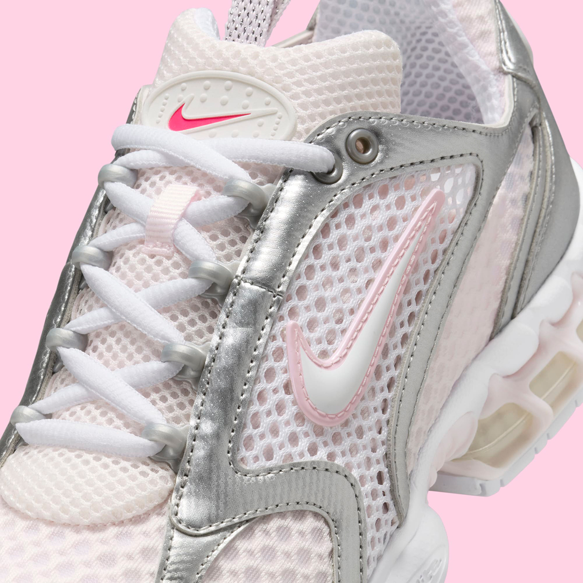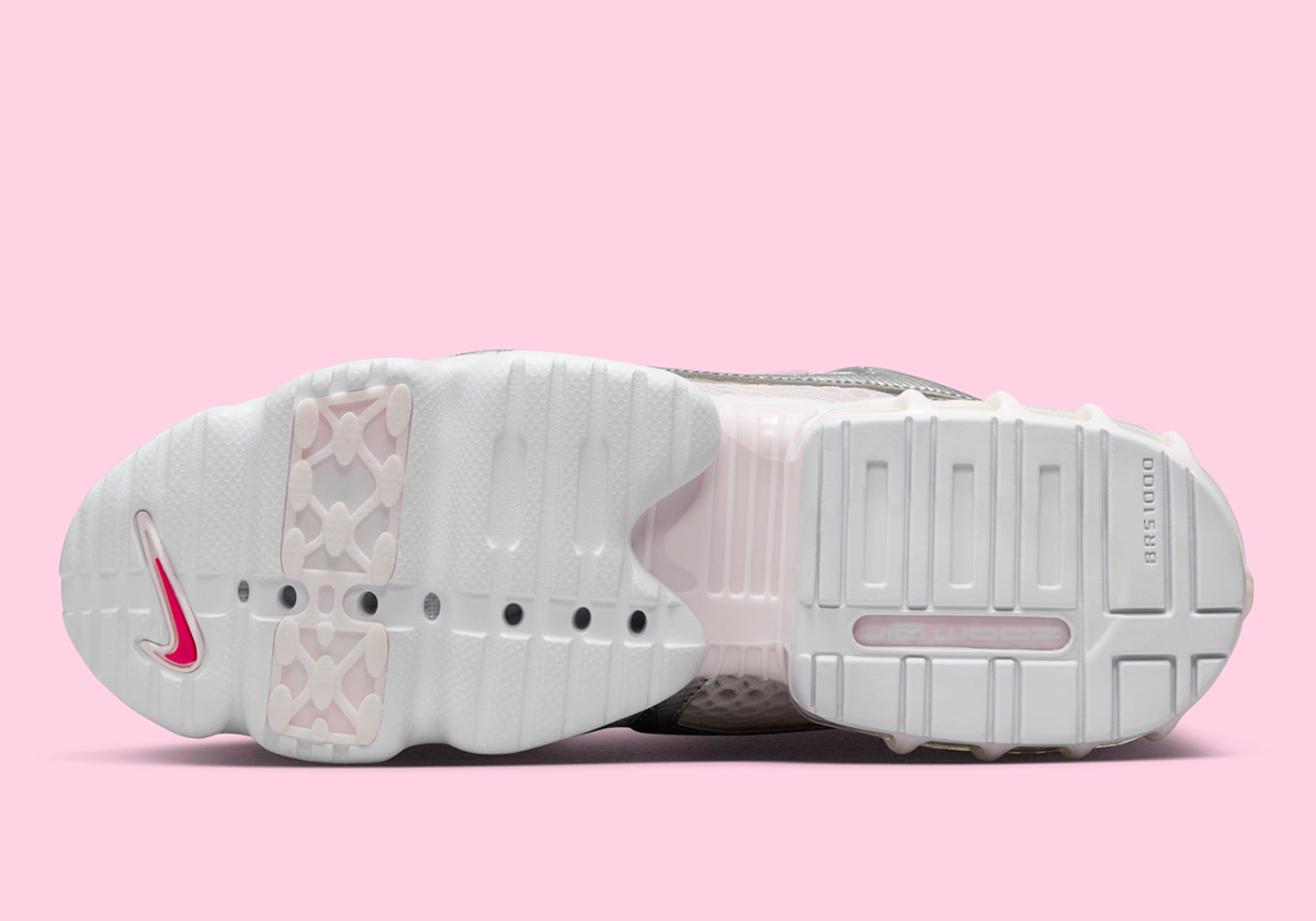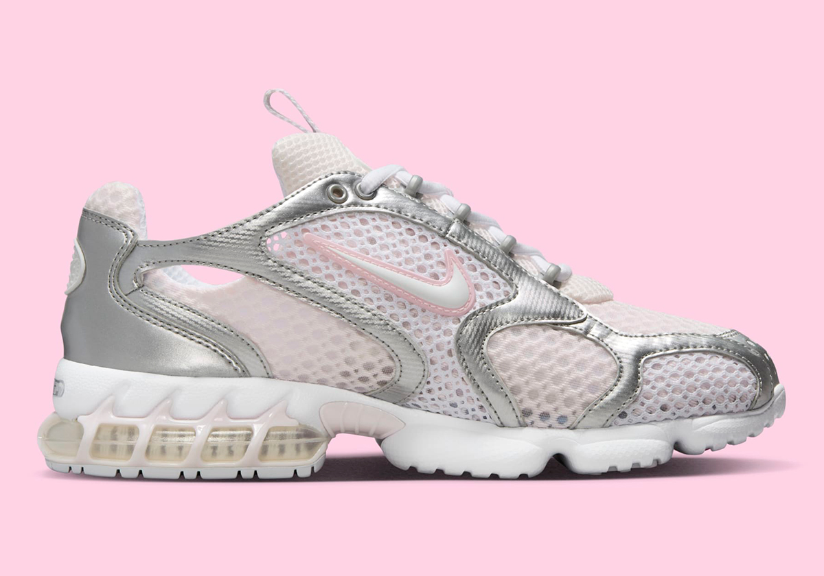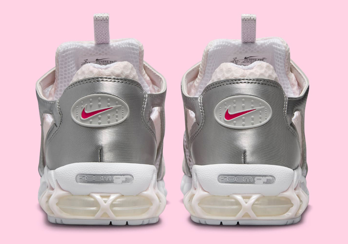 Each of those rosy hues gets its own moment in the spotlight, with the adjacent colors cropping up on the heel & quarter Swooshes, the midsole, and most impactfully, peeking through the wide mesh that stretches in between strips of chrome leather on the upper. Despite that relatively heavy dose of pink, reflective metallic is still the dominant note, perhaps portending what Beaverton has planned for the silhouette in this latest run. With the last retro minted as tech runner trends were truly beginning to take hold, the Spiridon Cage 2 could provide another model that taps heavily into those sensibilities, joining current spotlight shoes like the Nike Zoom Vomero 5, P-6000 or Pegasus 2k5.