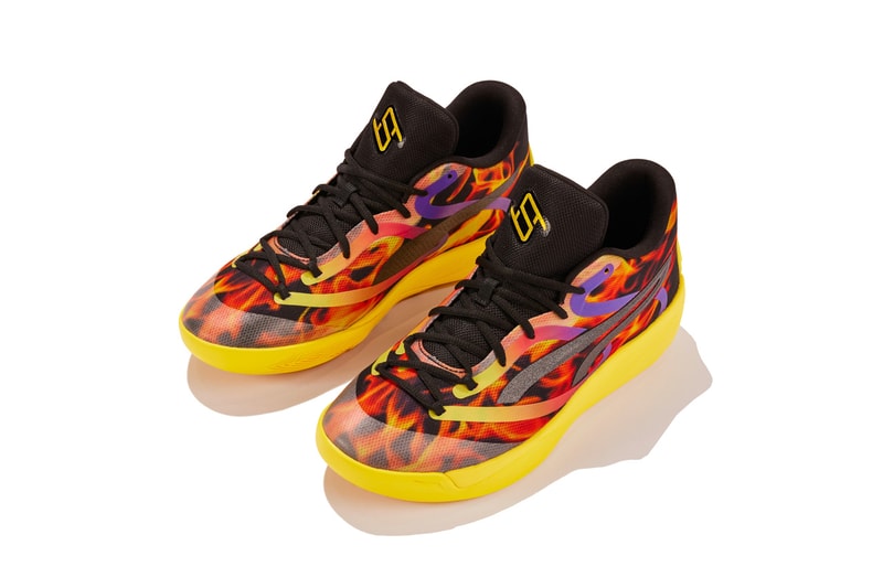 PUMA’s NITRO-infused midsole in a sunny yellow provides the basis for a black mesh body covered in an orange and red flame graphic. Emblazoned along the side of the sneaker are yellow-to-purple ombre slashes encircling a gray stripe logo.