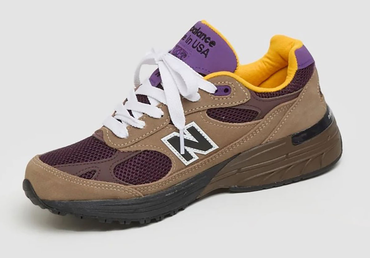 The first of three New Balance 993s helped kick off the seasonal collection, and now it appears the other two are on tap for September 2024, presumably next in line. This one balances between earthy hues and vibrant color pops, with “Mushroom” applied to buttery suede overlays. The base and underlays sport a darker hue to match the rear portion of the midsole, while towards the top of the shoe, “Midnight Violet” and yellow treatments render an entirely different aesthetic. The former shade appears on the tongue and backtab, while the latter spreads onto the lining. All told, the fusion of bright and contemporary shades produces a clear retro hiking vibe not far off from many New Balance trail shoe colorways.