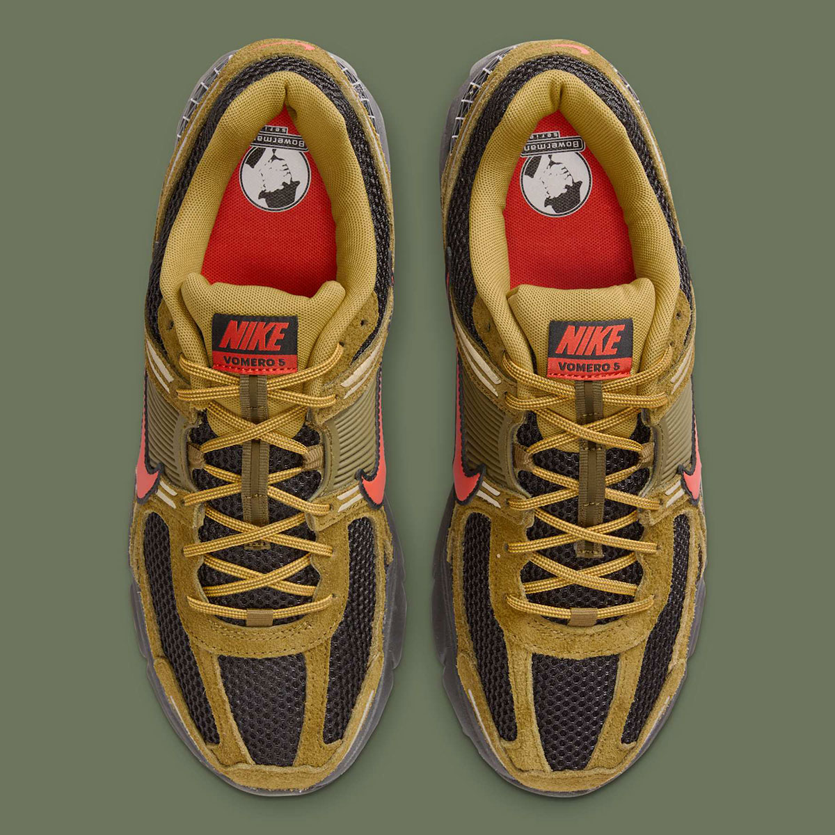 The “Olive Flak” hue appears on suede overlays from heel-to-toe, also settling on the cage at the quarter of both sides. Bright “Picante Red” accents on the Swoosh, tongue tag, and insoles bring these to life, fulfilling a nostalgic hiking shoe vibe akin to that of Nike ACG footwear. The base, heel counter, and entire sole unit appear in black, while workwear-like laces make for a compelling finishing touch.