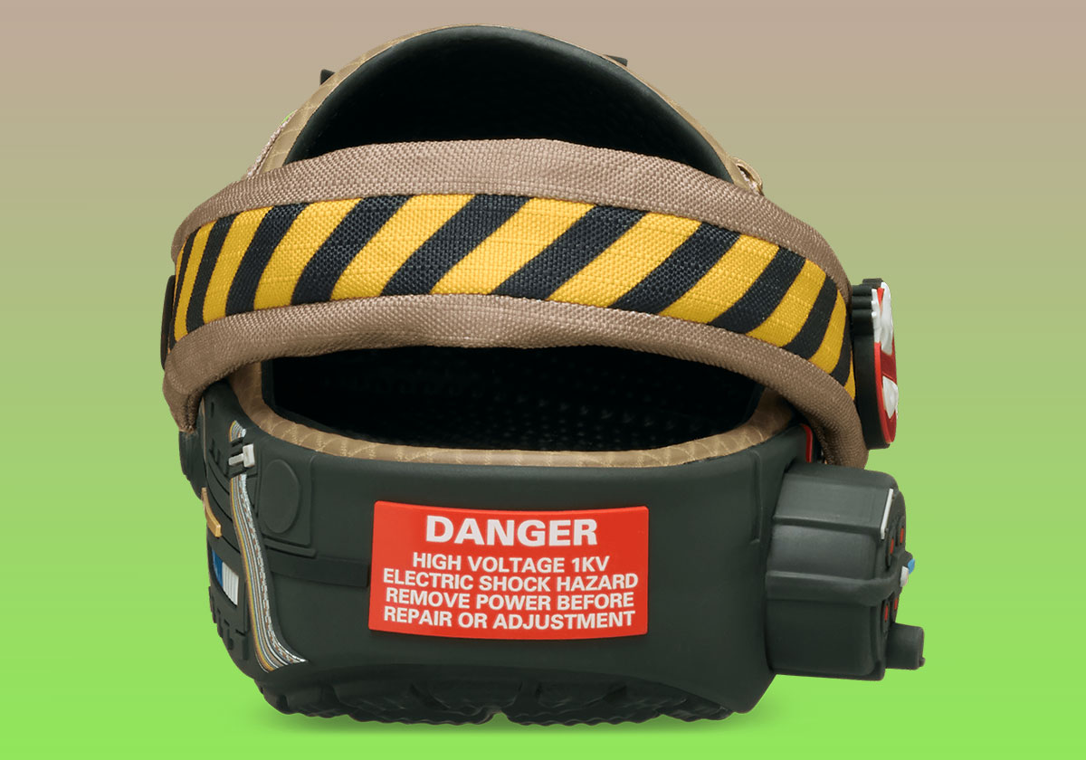 There, you can spot two of the most impactful tweaks to the Classic Clog, as a velcro strap allows you to swap between ID tags of each of the four OG Busters on the left shoe, while the right includes a zipper closure in its place. A heavy dose of additional hardware comes as you work through the rest of the shoe: the Proton Pack lends its hardware to the midsole, caution tape overtakes a padded Sports Mode strap, and splotches of Ectoplasm creep over each toe.