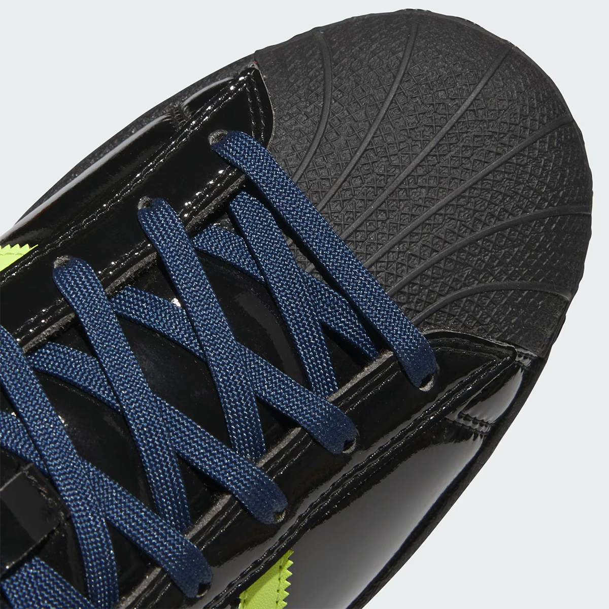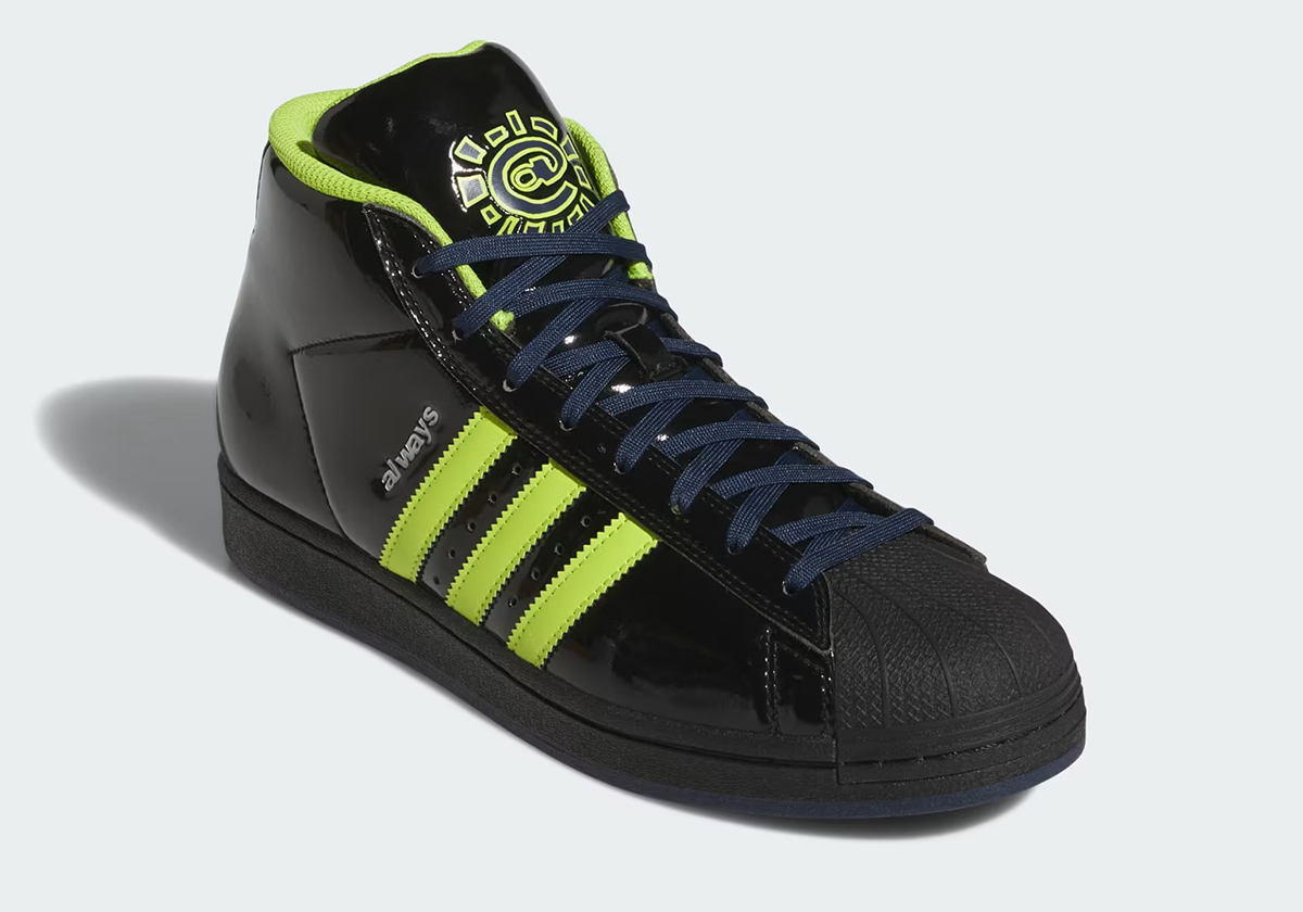 The sneaker in question; an adidas Pro Model ADV featuring black patent leather and attention-grabbing “Semi Solar Slime” on the stripes/lining. The brand’s signature “@” logo plays a big role, presented on the tongue, spine, and insoles. Silver “always” text runs along the stripes, while “Collegiate Navy” lands on the laces and outsole.