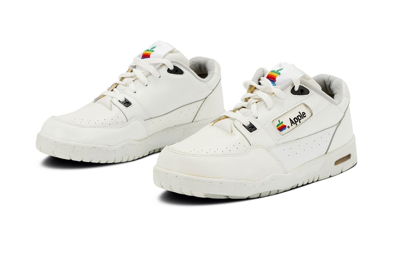 The ultra-rare pair was custom-made for Apple employees online and were a one-time giveaway at a national sales conference in the mid-’90s. There are slight imperfections such as the yellowing around the midsoles and light marks atop the toe boxes, but these are from age. Designed with a semi-chunky build that aligns with retro '90s style, the shoes are formed with white leather uppers and bear perforated details across the toe boxes and quarter panels. Signature Apple logos are positioned on the tongues and windows, both of which feature the tech company's vintage rainbow fruit insignia. The pristine condition and rarity of these kicks is what warrants the owner to jack up the price