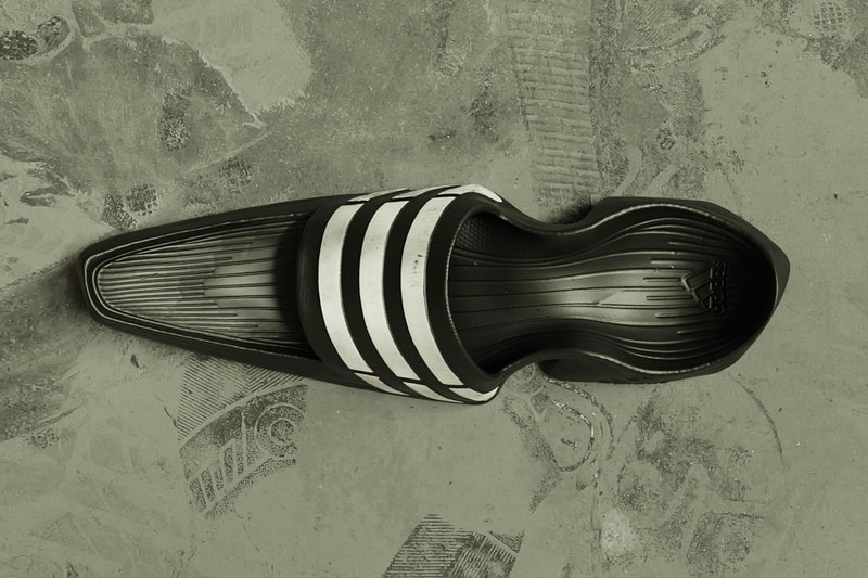 Taking to Instagram, the slipper has been tapered to create an aggressive point at the front. The rear has also been given a dynamic shape with a thick geometric sole segment. Branding elements include Three Stripes branding at the footband and an adidas motif at the patterned footbed.