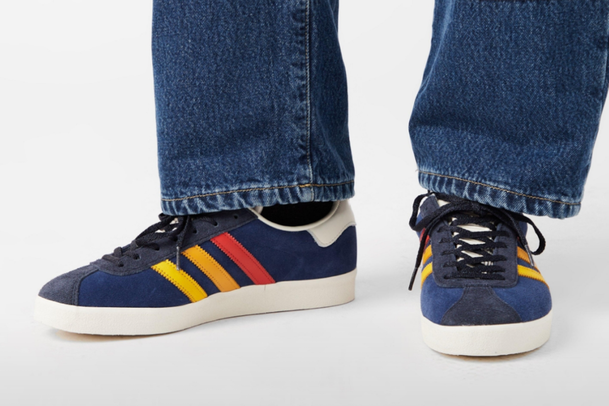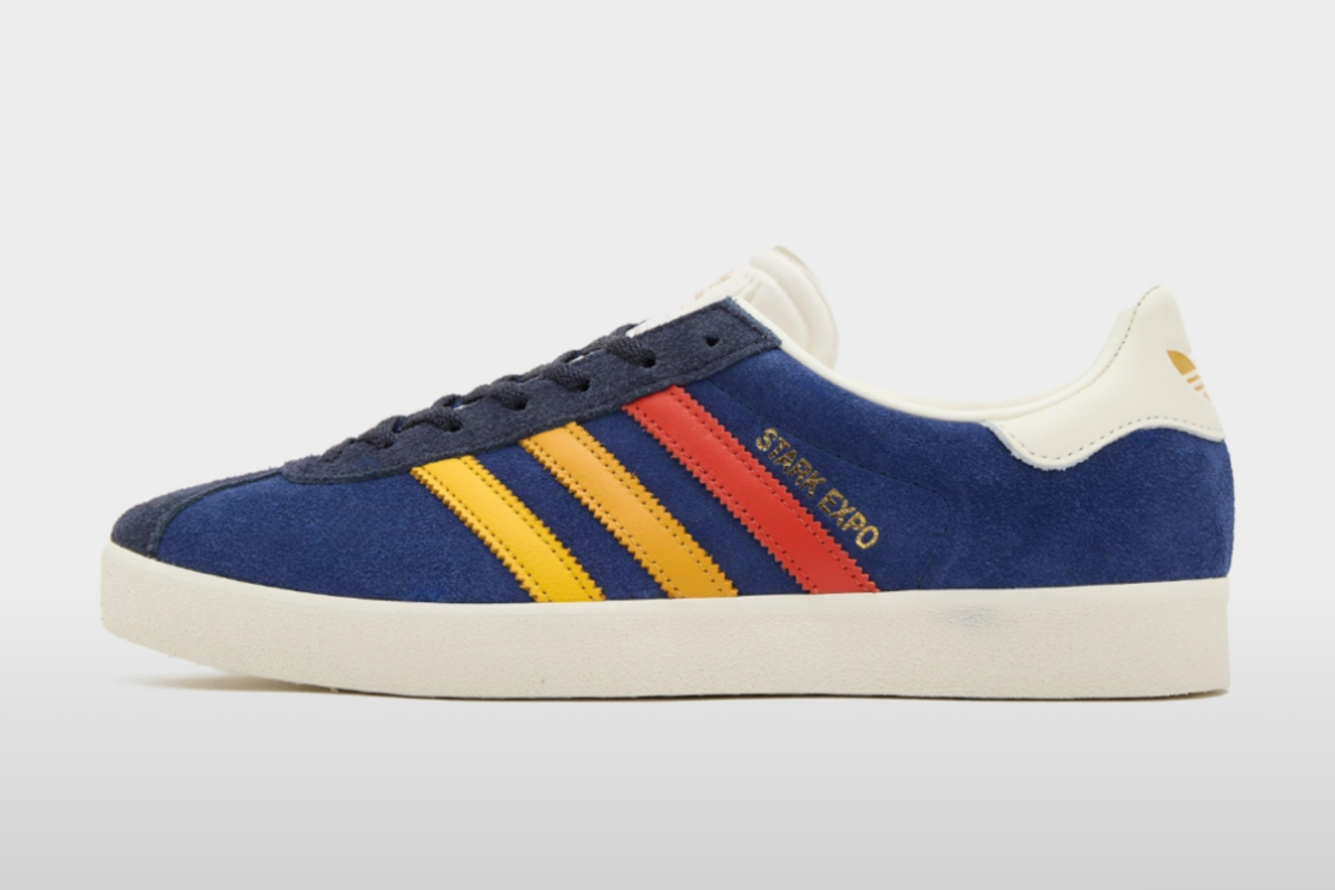 In contrast, the adidas Gazelle looks back to the original 1964 Stark Expo that appeared in the second Iron Man film from 2010. Borrowing a retro-inspired palette, a solid gradient of yellow to dark orange ensues across the smooth leather 3-Stripes while a navy blue suede consumes the upper in full with “Stark Expo” gold foil taking the model’s typical Gazelle branding.