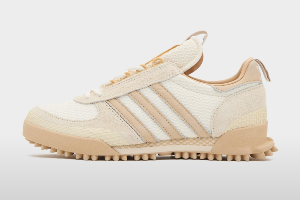 Nodding to the uniforms of Stark Industry employees, the renovated adidas Marathon TR is built for the workshop environment with rubber-printed toes, heel bumpers and rubber-dipped laces. The silhouettes’ striking trefoil outsole underfoot is color-matched to the clad-neutral upper above, draped in a cool white mesh with warm beige overlays.
