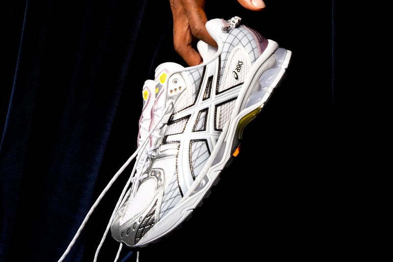 The shoe takes on a simple colorway, mostly dressed in white, black and grey. Constructed out of mesh, the ASICS branding on the medial is highlighted in black, over an gridded graphic throughout the shoe. The shoe features a pink iridescent heel counter to match the eyelets on the tongue while the tongue label and inner lining complement one another in yellow. Silver overlays accent the shoe as it sits atop a black outsole.