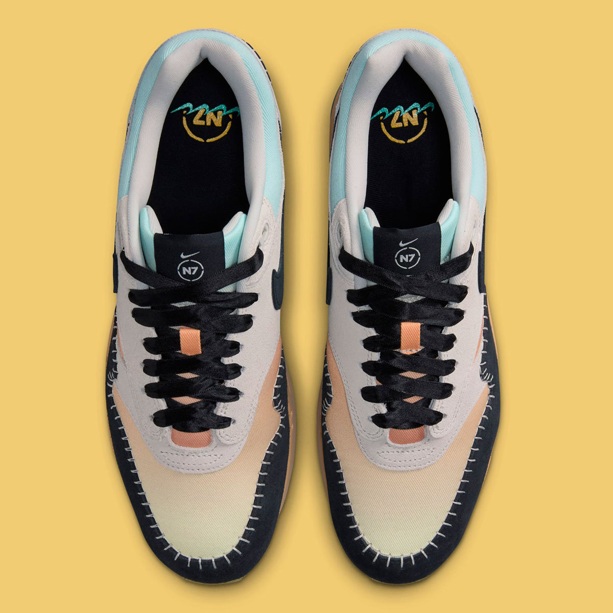 At the forefront of Nike Sportwear’s archival hits, the Air Max 1 appears in a breathtaking color palette of light orange and blue shades against a black suede mudguard and a sesame-colored midsole. Thick ribbon laces and exposed stitchwork add to the traditional appearance of the shoe, although the spirit remains true to the 1987 running shoe classic. N7 logos appear just on the tongue and insole, with a special barb of Swoosh logos sitting as the foundation of the emblem.