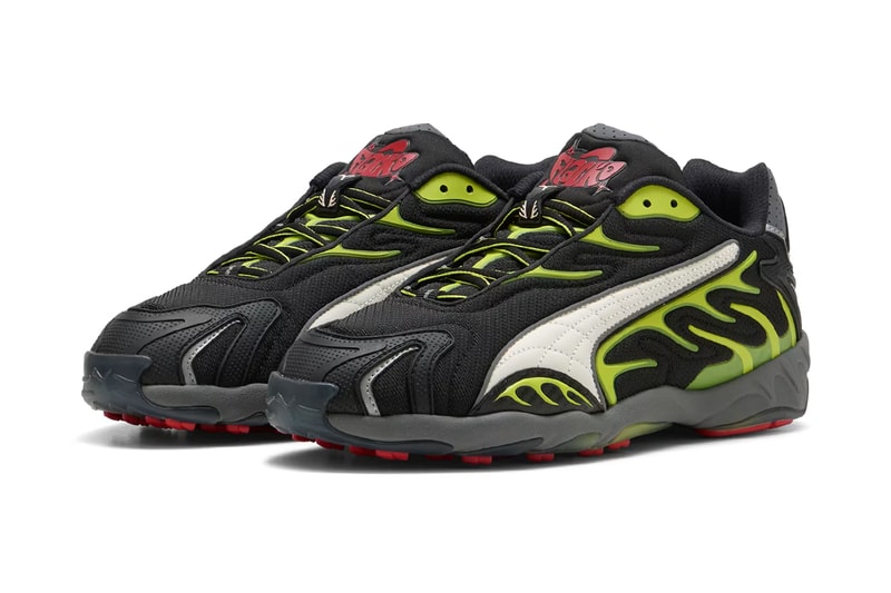 Following the previous news featuring the black and red Inhale and Mostro silhouettes, PUMA continues to keep up its momentum of collaborative releases with A$AP Rocky. Two new Inhale variants have now surfaced, comprising a mesh model in “PUMA Black-Warm White-Lime Pow” and a distressed neoprene iteration in “Warm White-PUMA Black-Pelé Yellow.”