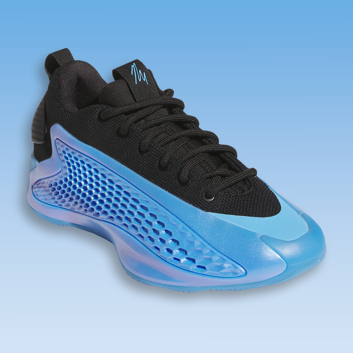 Here we have an “Blue Burst” shell against a black Primeknit interior, complete with a reflective toe box as we’ve seen across most Anthony Edwards 1 colorways to date. The shimmery, icy color is perfectly in-tune with winter, simultaneously aligning well with Minnesota Timberwolves jersey colors. Moreover, the triangular AE insignia that usually appears on the tongue is replaced by the primary logo for the “Anthony Edwards Five” adidas Basketball program. The gallery below shows a GS pair, but the shoe will also be available in adult sizes.