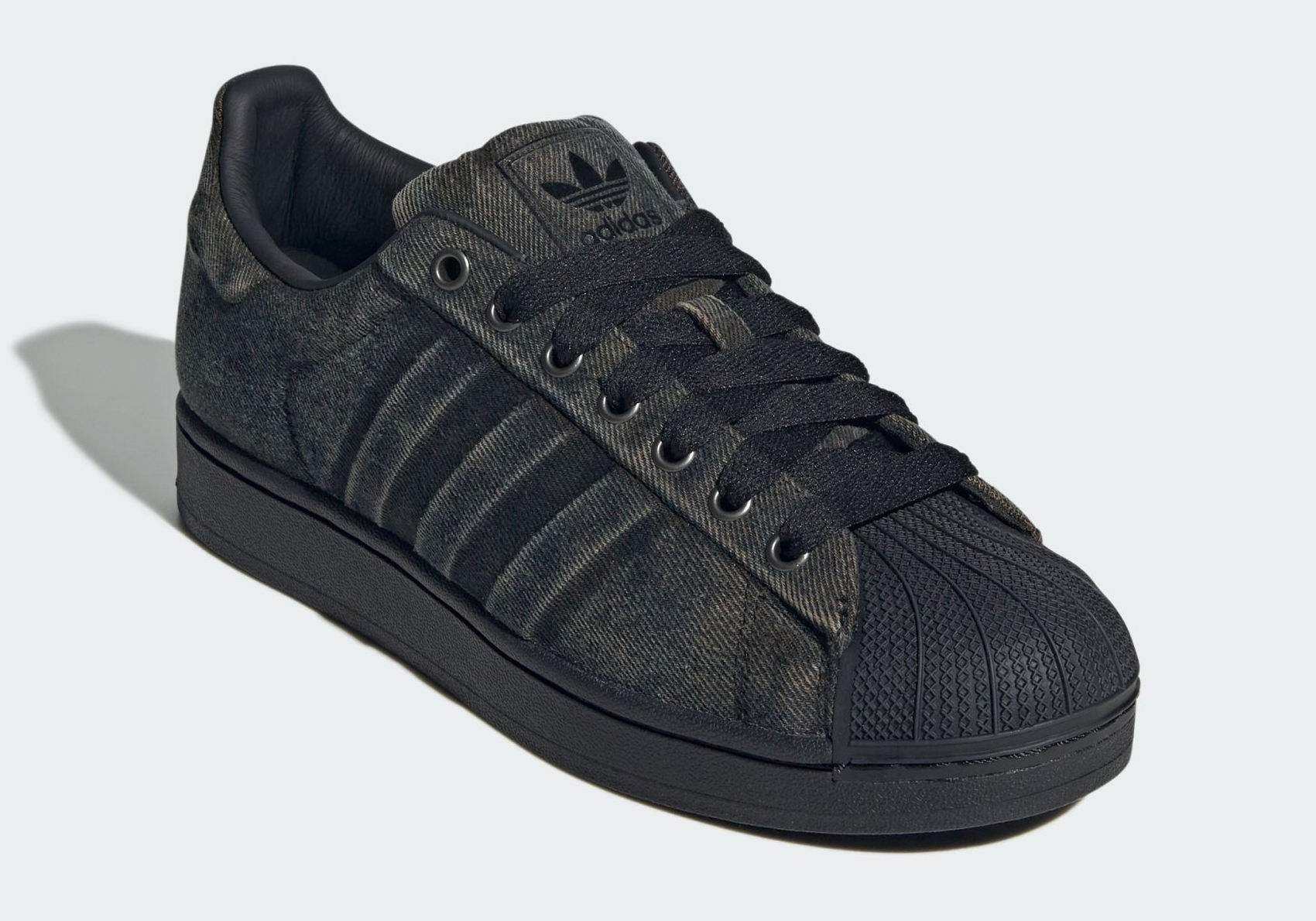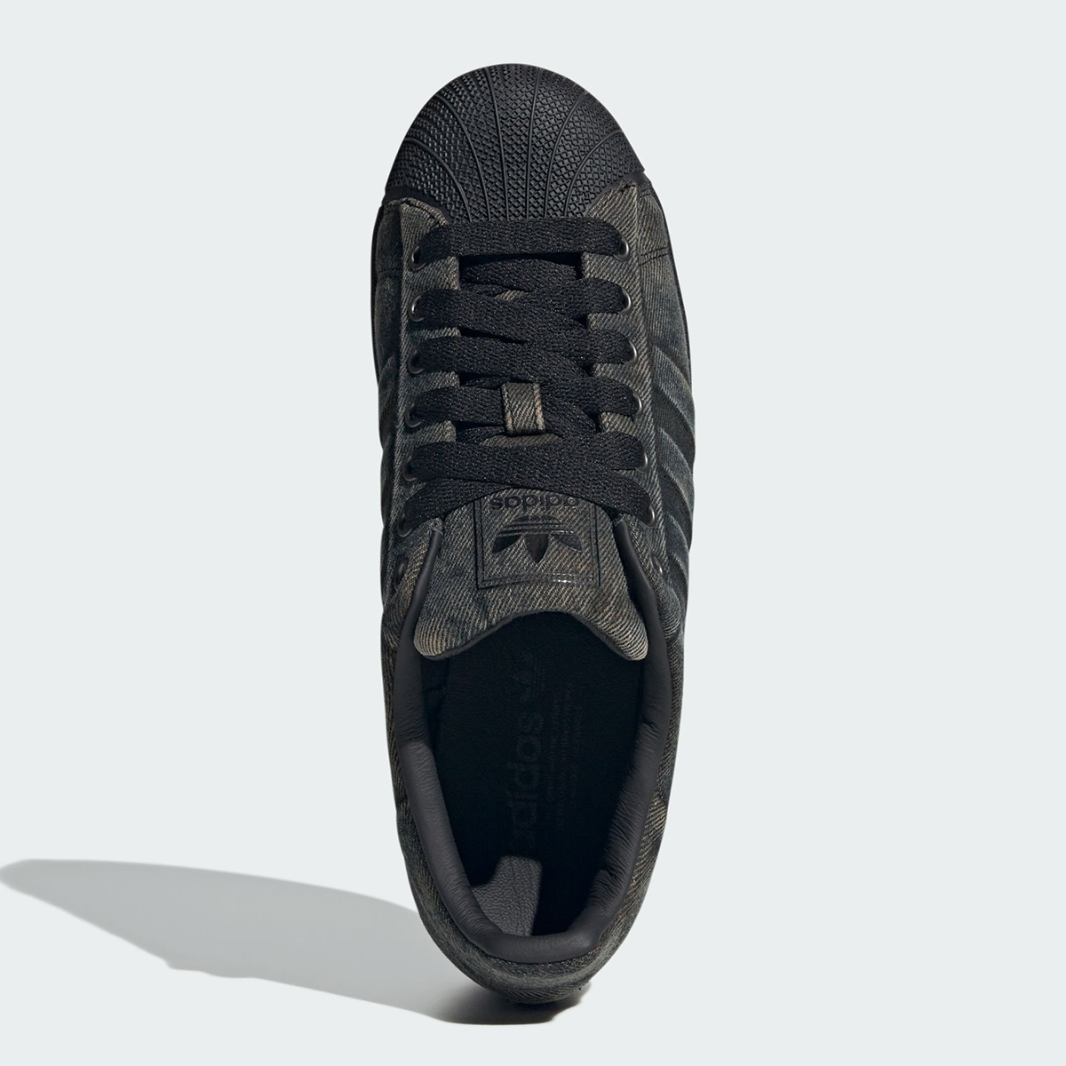 Two contrasting applications are on task, beginning with a grungy all-black. Built atop the Superstar 82 composition, aimed at recreating the original Made in France layout, washed patterns overcome the hardned fabric, bringing it closer to a dark grey in select splotches through the profile. At the quarter, you’ll find the biggest structural shift outside of the titular fabric, as the Three Stripes poke from underneath for an embossed flair rather than the usual stitched, tangible presentation. The partnering pair largely keeps the same script intac but opts for a different color-up, wearing more traditional blue hues on its exteriror while opting for white counterplay within the liner, laces, shell toe, and sole.