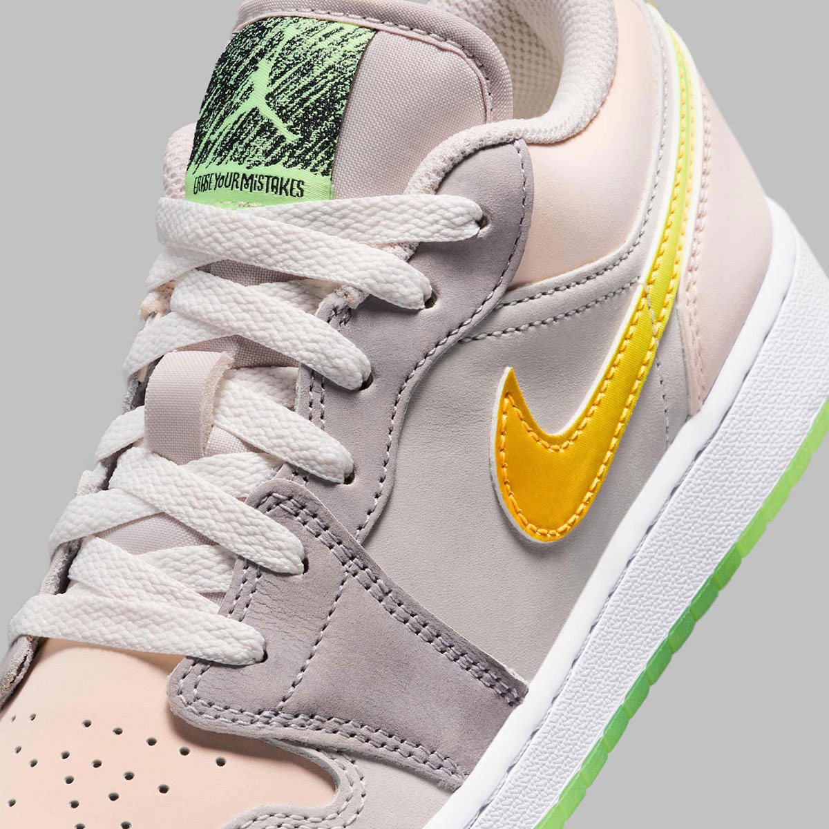 For a tangible reminder, a white/green Jumpman eraser highlights the peripherals that come with this pair, lighting the primary accent scheme on this shoe and starkly contrasting the grey/light pink foundation. Adding one last piece of hi-vis accenting is the gradient Swoosh, taking things from a resplendent yellow to the same neon green from the quarter to the heel.