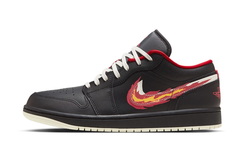 Nowadays, it isn't uncommon to spot Jordan Brand kicks in non-basketball sport settings. In the NFL, many players wear rare Air Jordan cleats -- featuring everything from the 1 in its iconic colorways to team-themed Air Jordan 14s. Another sport that has seen an uptick in Jumpman appearances is golf. A favorite activity of Michael Jordan's, it's no surprise that he enlisted his design team to tap into the greens. Recently, a greater focused has been placed on skateboarding with launches such as the Nike SB x Air Jordan 4 "Pine Green" bringing sneakerheads and skaters together.In continuation of this crossover, Nike revealed a new "Born to Fly" theme in white and "University Blue" earlier this month on the Air Jordan 1 Low. Now, it has appeared with a black and "Fitness Red" combination. Utilizing a color palette fitting for fans of the red-hot Miami Heat, the sneaker utilizes a leather construction that sees red and orange light up its white Swooshes. A striking red lining and metallic-colored tongue also enliven the pair while various skate-themed drawings and phrases appear at the medial and interior.Nike has yet to disclose any release information regarding the Air Jordan 1 Low "Born to Fly" in this black and red colorway. Stay tuned for official launch details as we expect it to arrive via the Swoosh and select Jumpman retailers in the coming months at a price of $120 USD.For more of the latest news in the footwear industry, be sure to check out the women's-exclusive Air Jordan 1 High OG "Praline" -- inspired by luxury handbags with its ribbon-like laces. Click here to view full gallery at Hypebeast