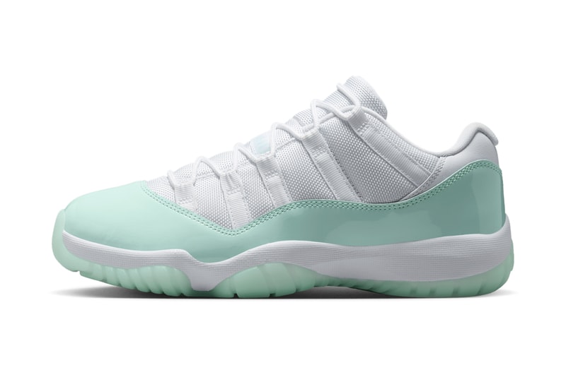 The next launch to feature the Air Jordan 11 is the low version of the sneaker donning a new women's-exclusive "Igloo" look. Its signature pastel green hue covers the mudguard, which again features a patent leather finish. The remainder of the upper is a blank canvas in white, save for a touch of baby blue at the tongue's Jordan branding. Its "Igloo" green then returns at the outsole, which is mostly semi-translucent in appearance.