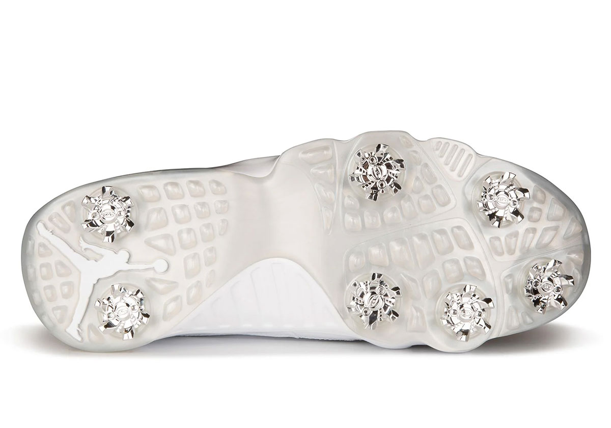 Appearing in an elegant white/silver colorway, the Air Jordan 9 Golf stands out with an all-white leather construction with translucent icy grey rubber bottoms, an matching Wolf Grey interior lining, and metallic silver chrome touches on the external eyelet pieces, the globe-shaped token at the heel, and the removable spikes at the bottom.