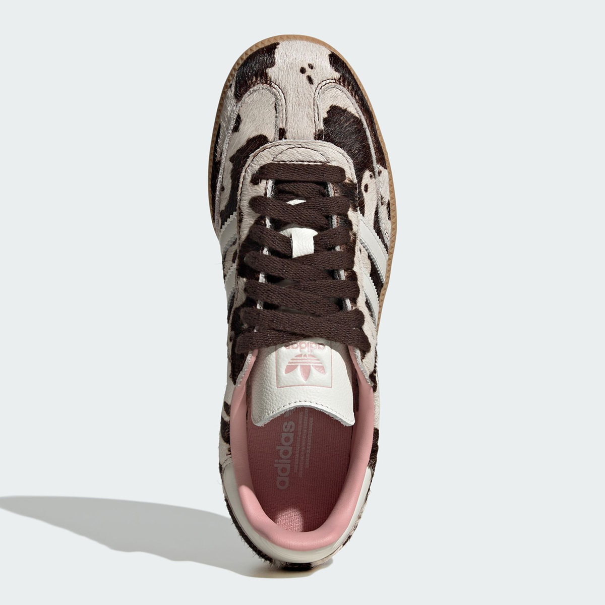 Made to resemble a brown and white cow, the Samba here features a faux pony hair exterior with abstract splotches throughout. What makes this release unique is a pink leather sockliner — a welcome feminine touch that also ties in effortlessly with the cow’s snout (or udders, whatever comes to mind). White leather stripes are complemented by standard flat laces in brown, while the tried-and-true light gum brown outsole polishes off the Grade-A delivery underfoot.