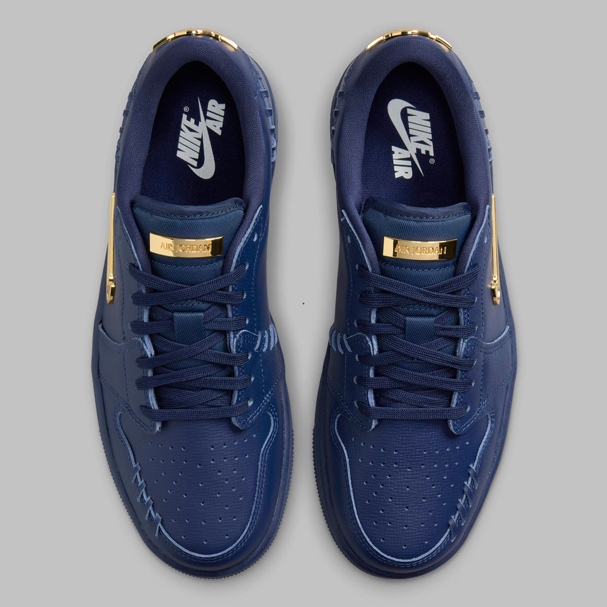 It’s certainly a stealth look in “Triple Navy,” embracing the aquatic tonality essentially from heel to toe. The Method of Make’s calling cards remain loud of proud, from the gilded tongue tab and mini-Swoosh, the exagerrated exposed stitching on the textured, croc-like leather that drapes the full upper. With this look added to the catalog, we now stand at more than half-a-dozen of these monochromatic outfits, giving you a full range to pull from if the luxurious atmosphere of the model speaks to you. Just for completion’s sake, the Air Jordan 1 Method of Make spans green, tan, black, red, brown and now, navy. Additionally, a “Black Cat” Jordan 1 Low serves as the one colorway to break from that tonal theme, sporting cartoon detailing atop a white & black two-tone.