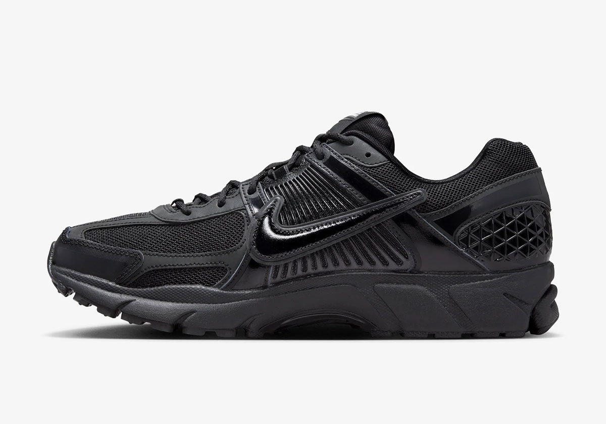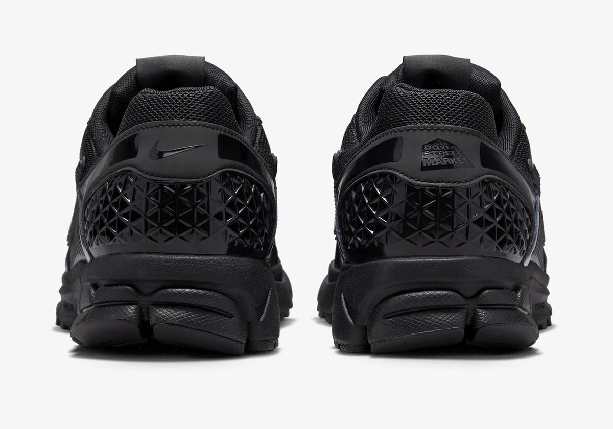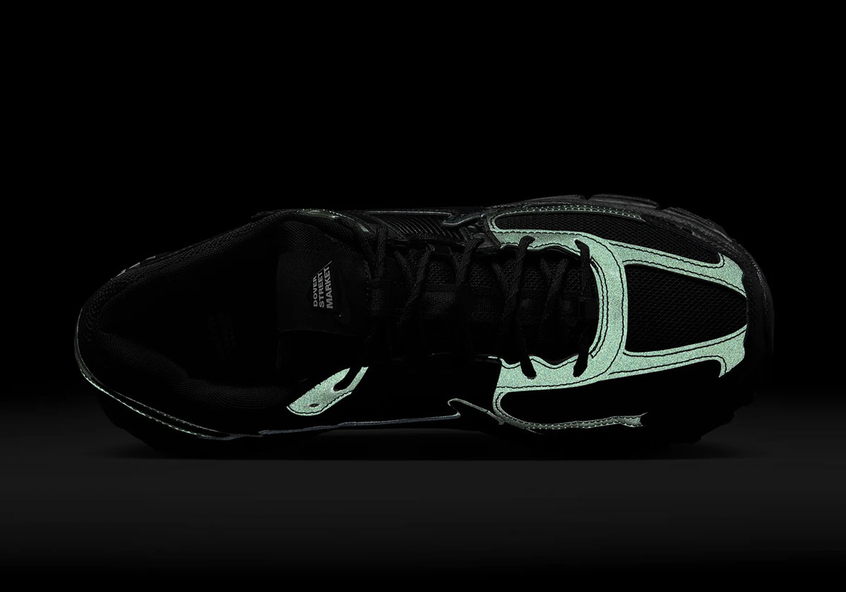 As is typical for the high-end fashion boutique, DSM checks in with a contemporary “Triple Black” colorway. However, hit the lights and you’ll find that the overlays and Swoosh border feature a reflective emerald green tint. The hidden accent color tributes Dover Street Market’s 20th anniversary, with emeralds being the traditional coinciding gemstone. For branding, a new slanted DSM logo appears on the tongue and heel. There’s not a whole lot else that separates these from Nike’s inline “Triple Black” Vomero 5 from an aesthetic standpoint, although there are some key texture swaps to note. The overlays feature smooth, not textured leather, and the base features a somewhat tighter mesh weave.