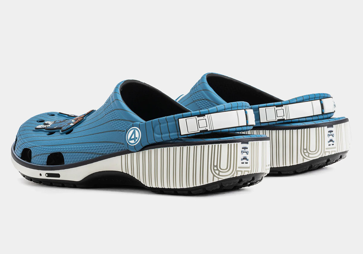 We’ve gotten used to seeing extremely embellished Crocs collabs, but these are actually fairly tame and wearable. The Croslite upper portion comes in light blue with black pinstripes, matching the look of the Fantastic Four’s costumes. The heel strap incorporates the belt part of the group’s uniform, accompanied by grey-on-white lines on the heel portion underneath. Mister Fantastic, Invisible Woman, Human Torch, and The Thing each get their own Jibbitz charms, not to mention a “4” for the group’s insignia.