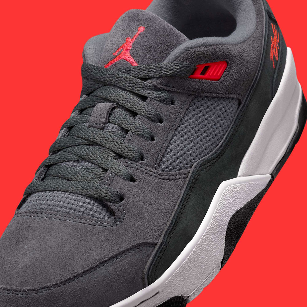 The Bright Crimson is a clear nod to “Infrared”, a hue made iconic by the Air Jordan 6. That only appears in subtle ways via the eyelets, Jumpman on the heel, and the Flight script, while the upper leverages a solid grey on the suede and canvas uppers. Black mudguards surround the upper, while the lightest of grey tints comes through on the late 80s-era style midsole.