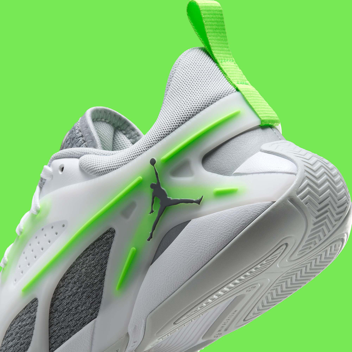Intentional or not, this latest take on the women-led Jordan Heir takes after the Quai 54 Air Jordan 5 from 2011 with a likeminded fusion of “Wolf Grey” and “Electric Green.” To the uninitiated; the Quai 54 Jordan 5 was one of the first shoes crafted in honor of the Jordan-sponsored Paris streetball tournament and is still largely thought of as one of the strongest Quai 54 releases of all time. “Electric Green” accents touch up a semi-clear outer shell here, complemented by white leather overlays across the forefoot and “Wolf Grey” mesh underneath.