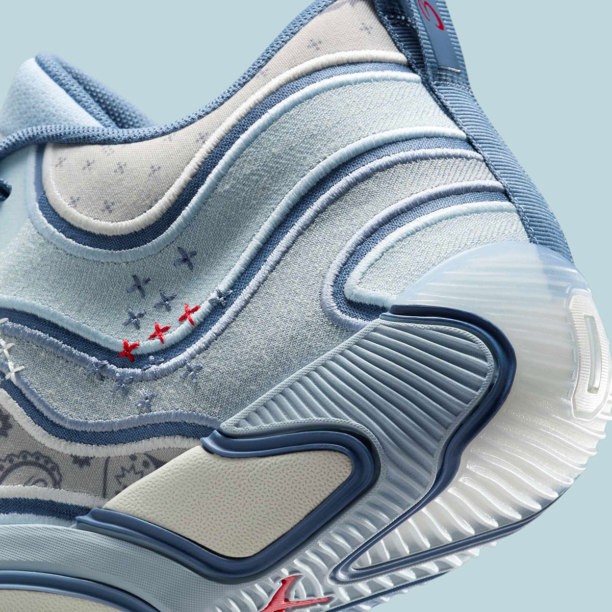 It’s a sprightlier spin on the already-revealed black denim edition, largely functioning as a palette swap on the construction that shoe tipped off. Namely, scattered deconstructed details alluding to the Japanese tradition of Boro stitching peer through on the curvilinear windows in this shoe’s upper, further bolstered by paisley patterns and ribbed embroidery. The grounded ties to Tatum’s hometown also stick around with the “314” tag on the rear pull tab. Switching into a more traditional jean arrangement is only natural, and leaves the door open for further spins on this concept.